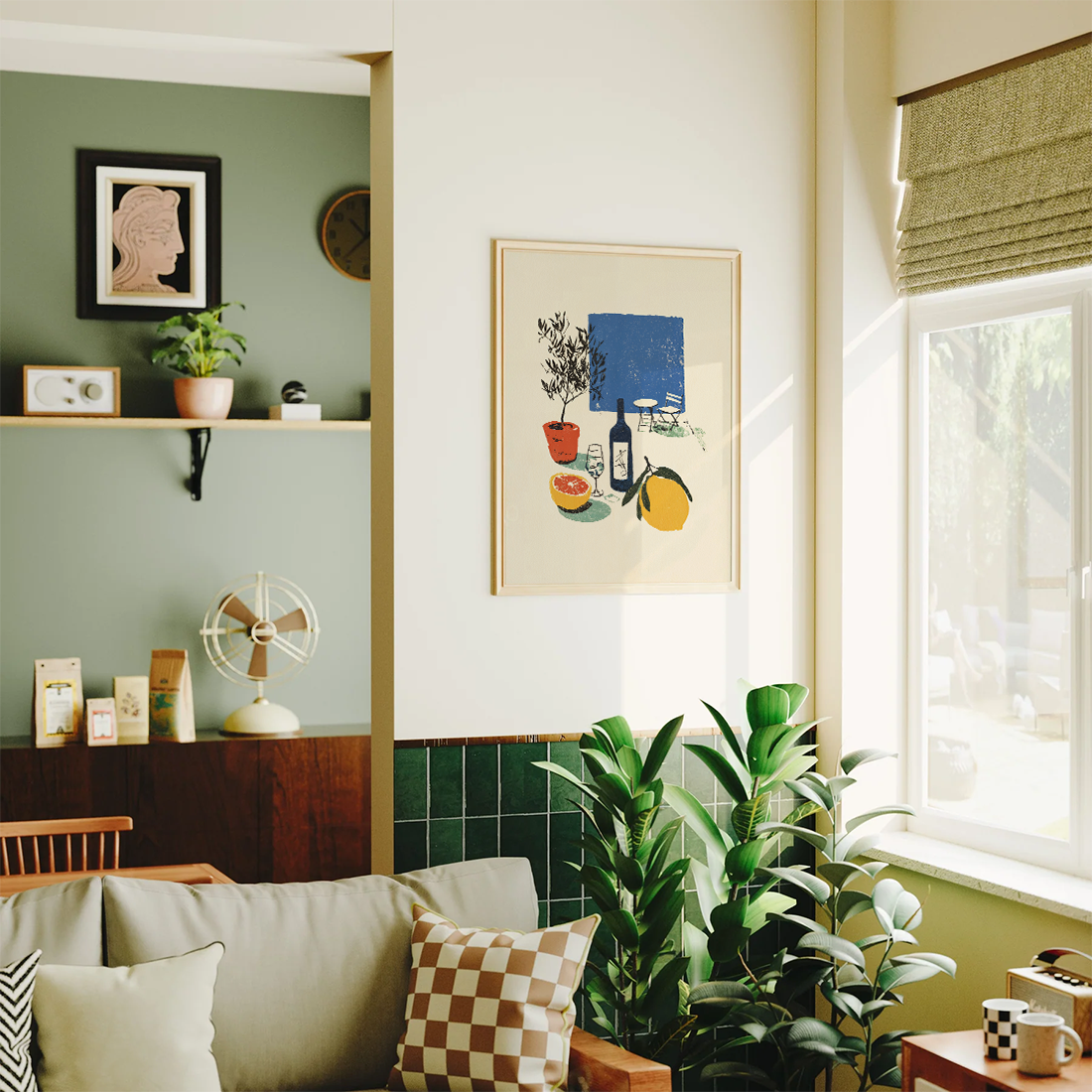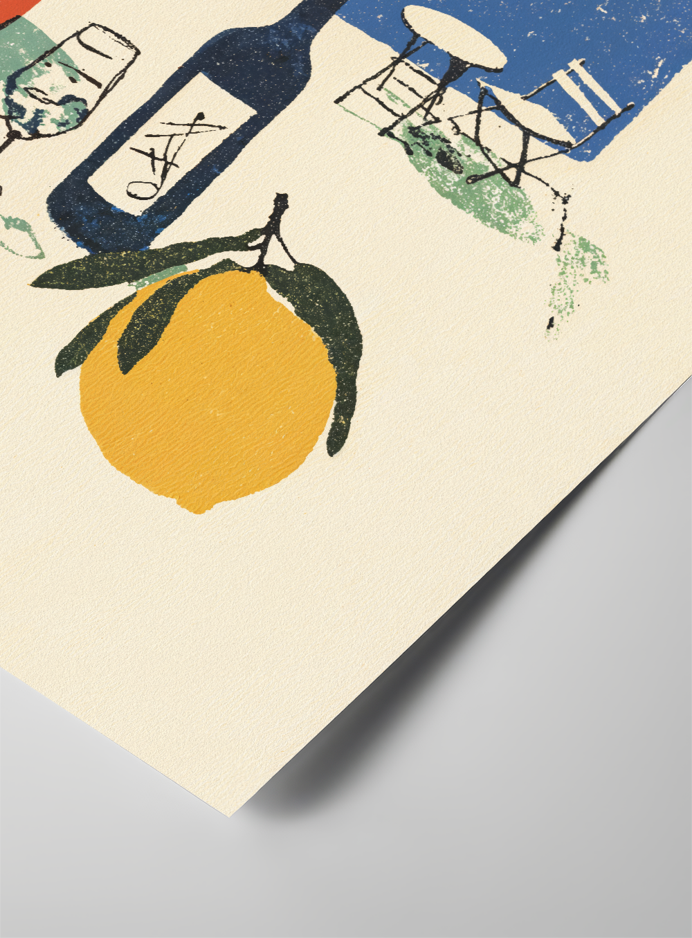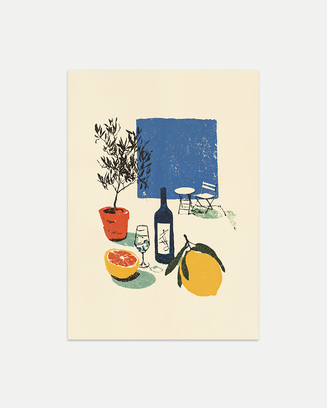 A vintage-style illustration featuring a tranquil outdoor scene: a leafy plant and a bottle of wine in the foreground, with a small table and chair set nestled in the distance. The composition is set in front of a small blue square, evoking the open sky.