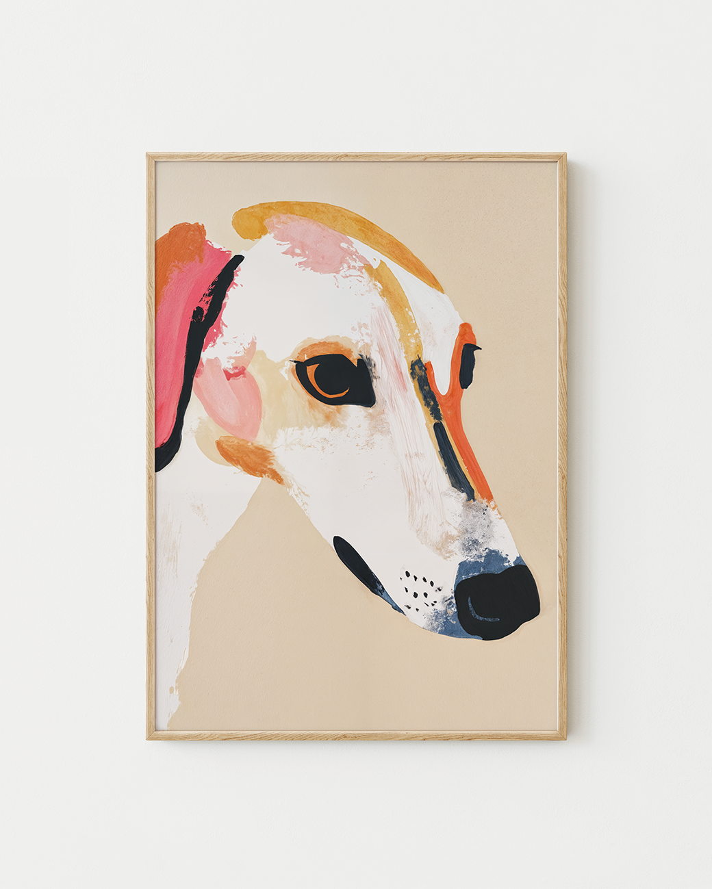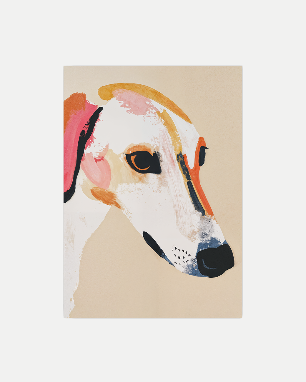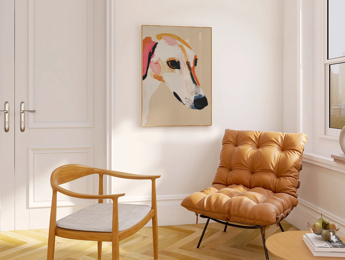 A mixed media painting depicting a close-up of a dog intently focused on something just out of view.
