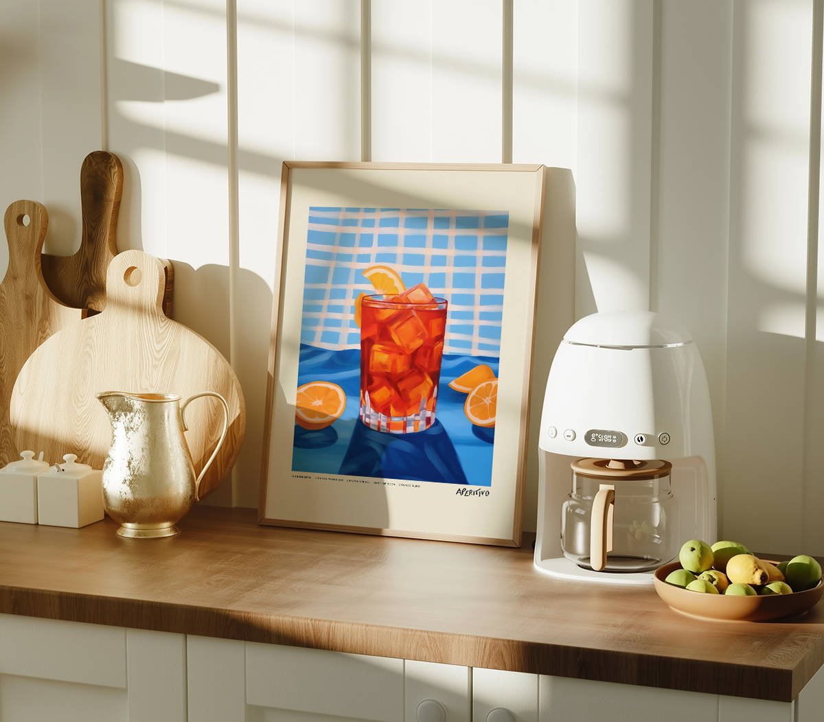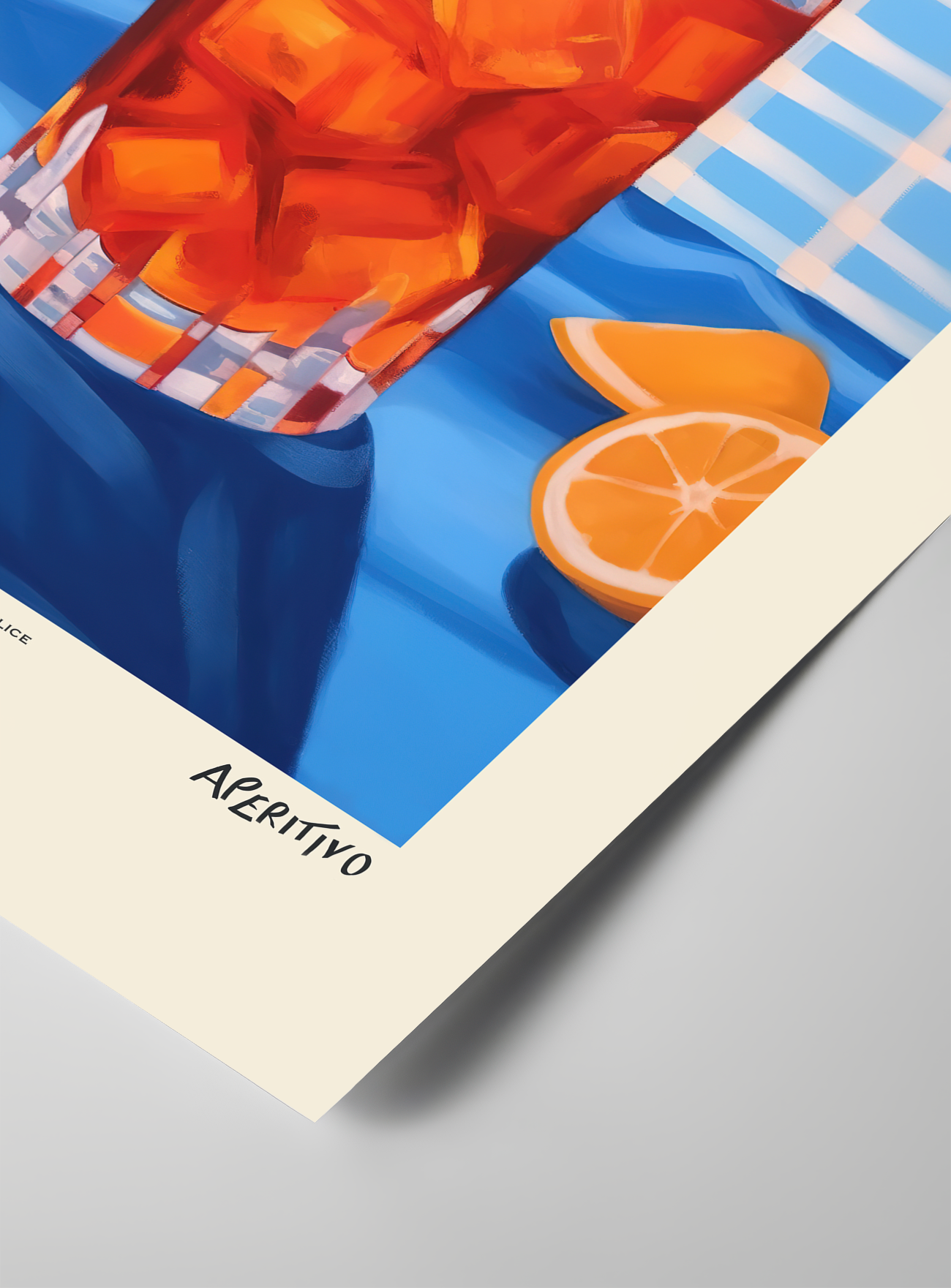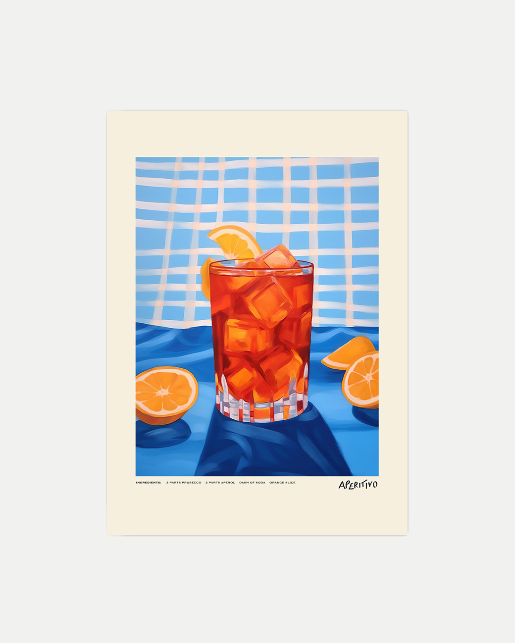 A painting of an Aperol Spritz cocktail. The ingredients for the cocktail are outlined underneath the painting alongside the title ‘Aperitivo’. The painting sits on a light beige background that frames the design.