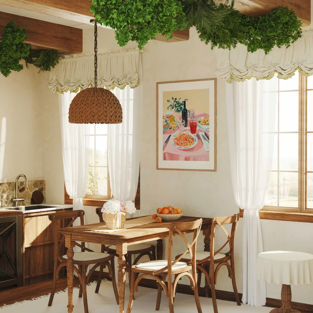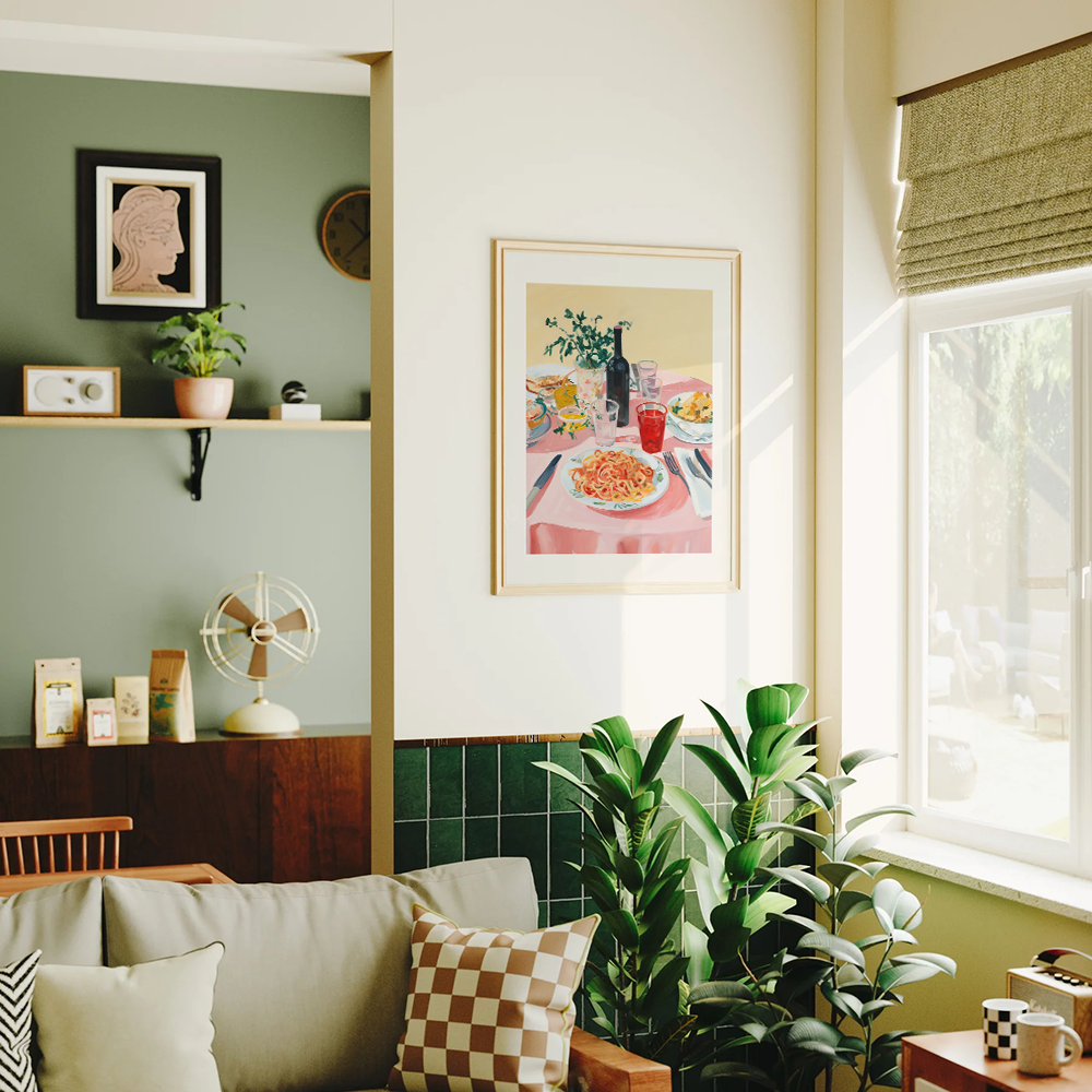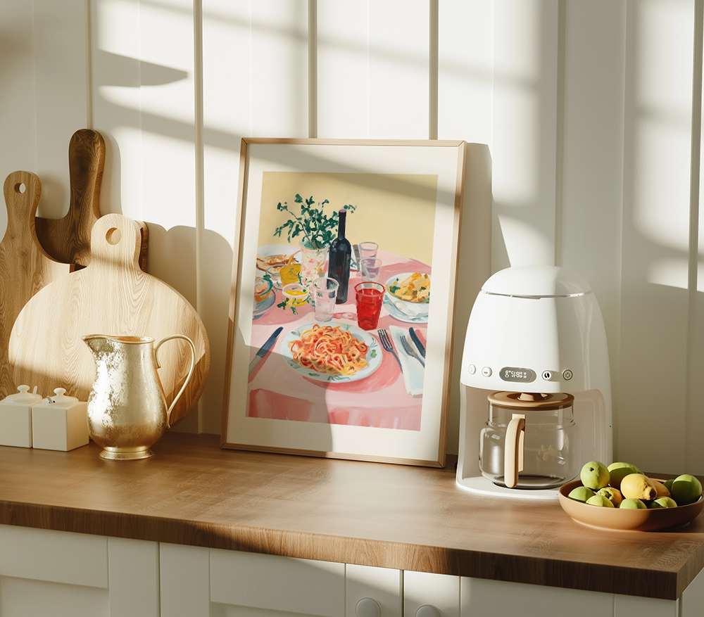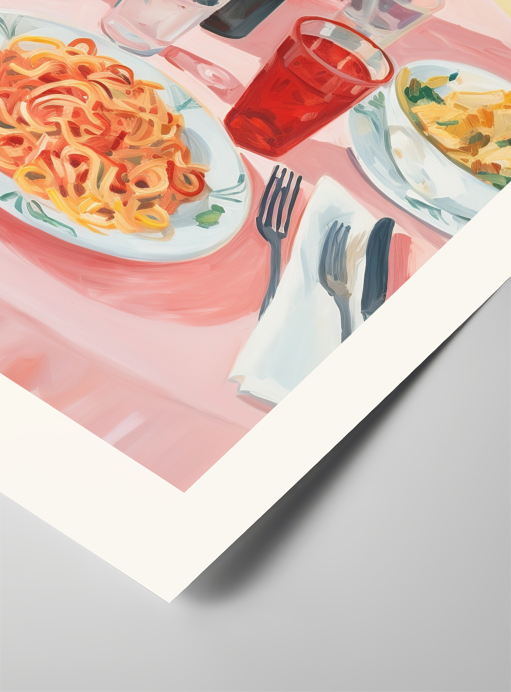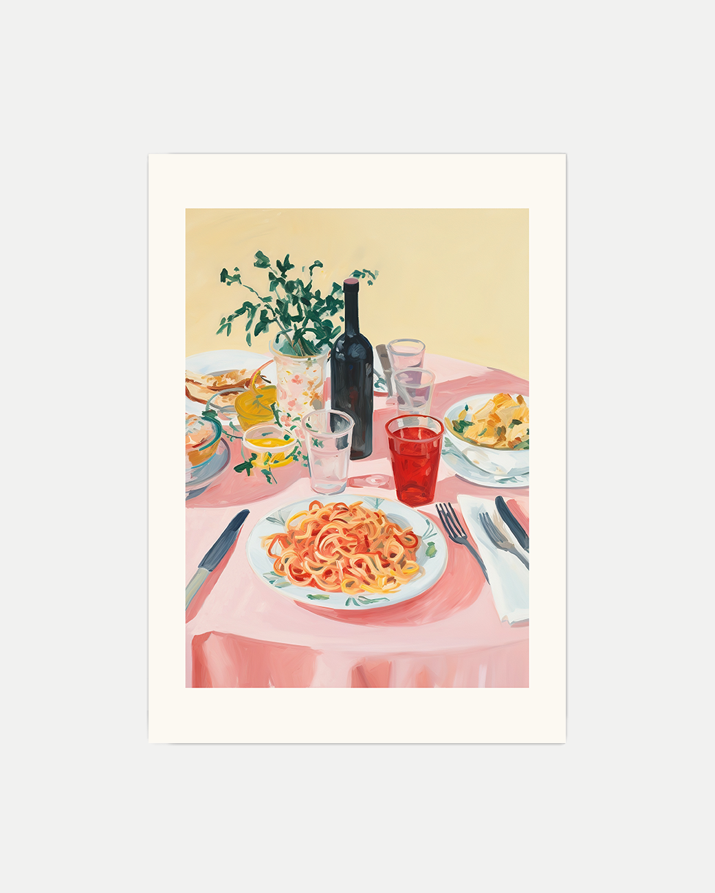 A painting of a dinner table scene with light yellow and pink pastel colors. The painting has a white border that frames the design.