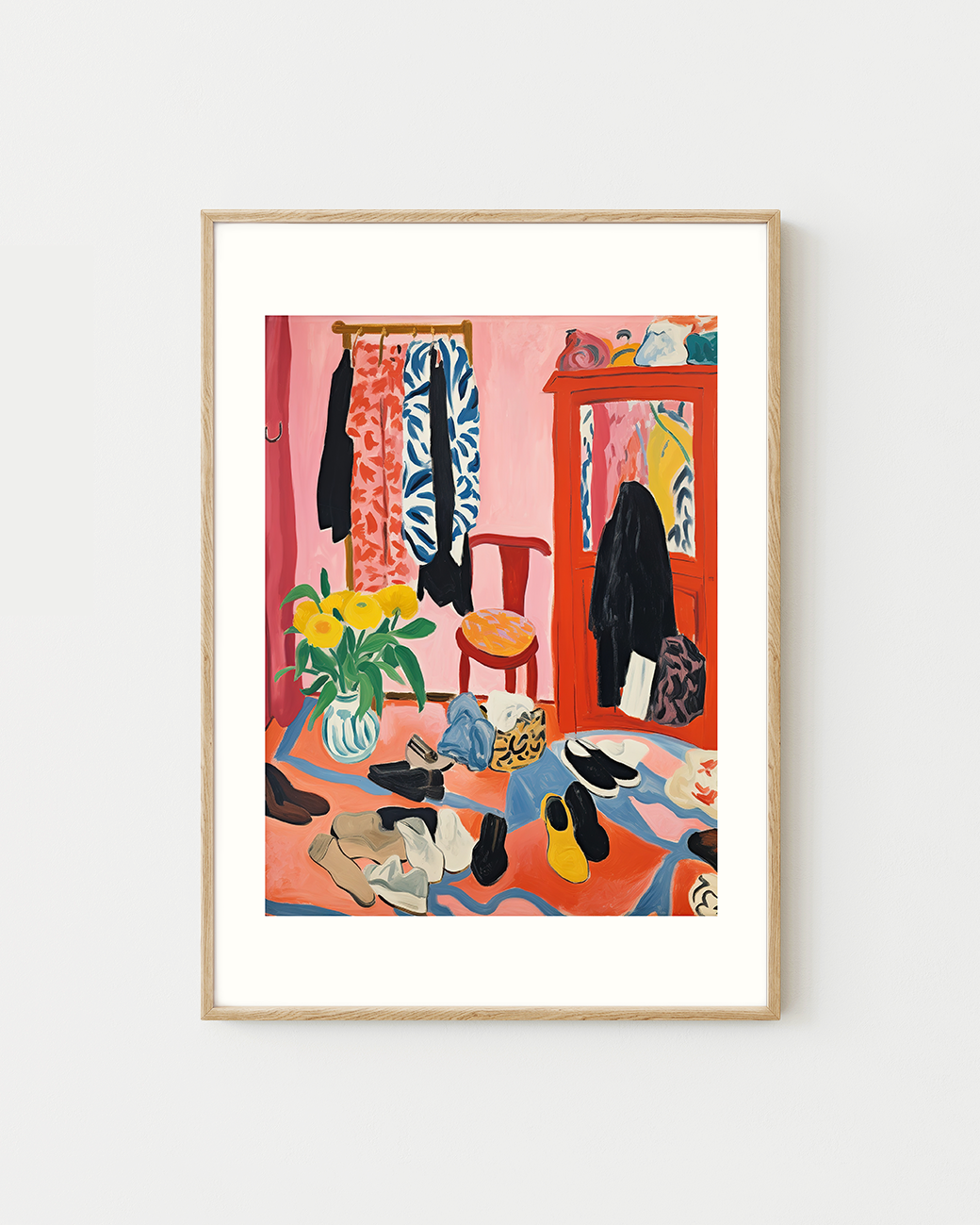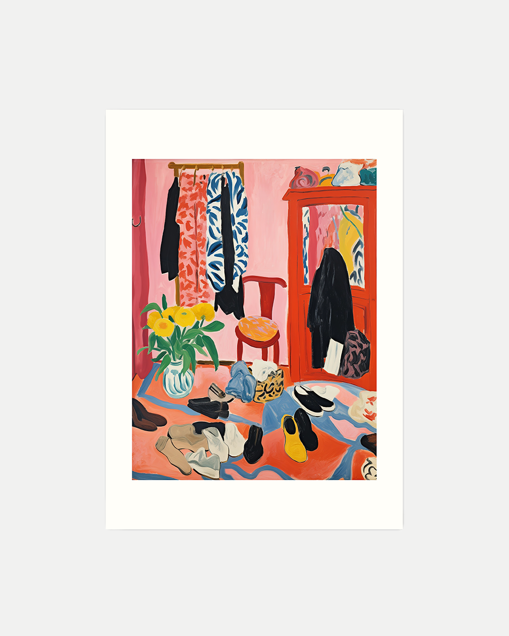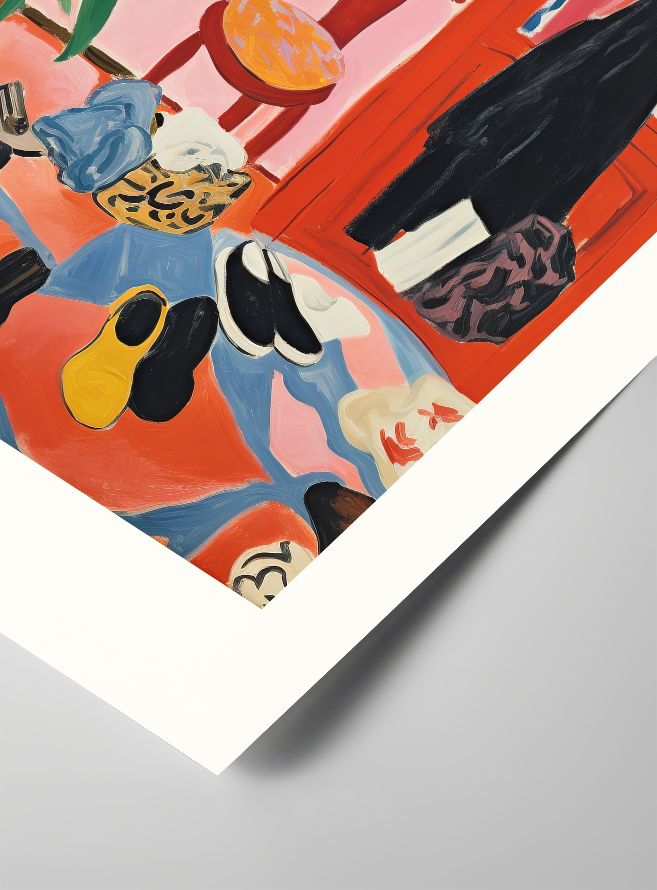 A multicolored painting of a messy bedroom floor with crimson tones. The painting has a white border that frames the design.