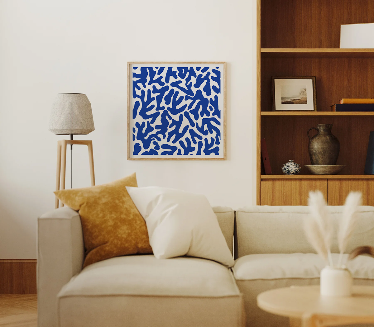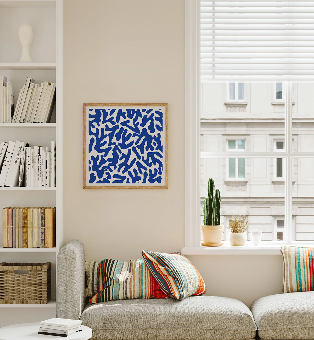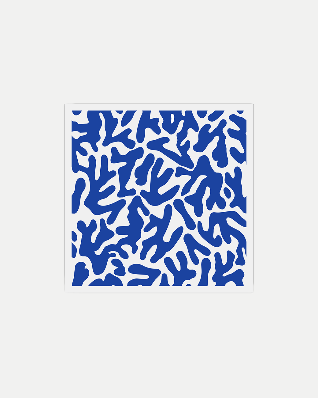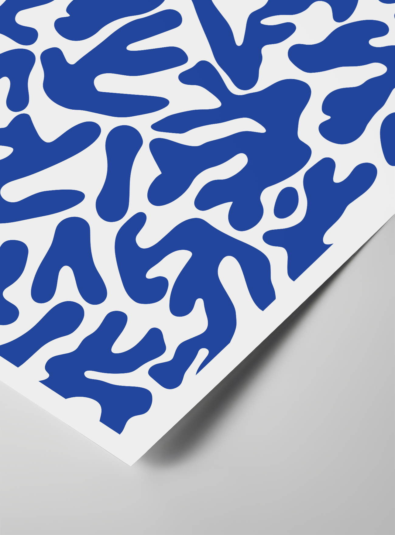 An illustration of abstract blue fluid shapes. This print has a border which frames the design.