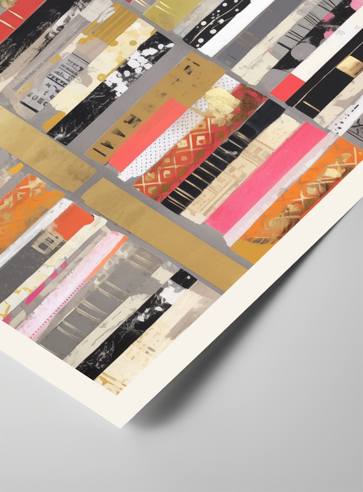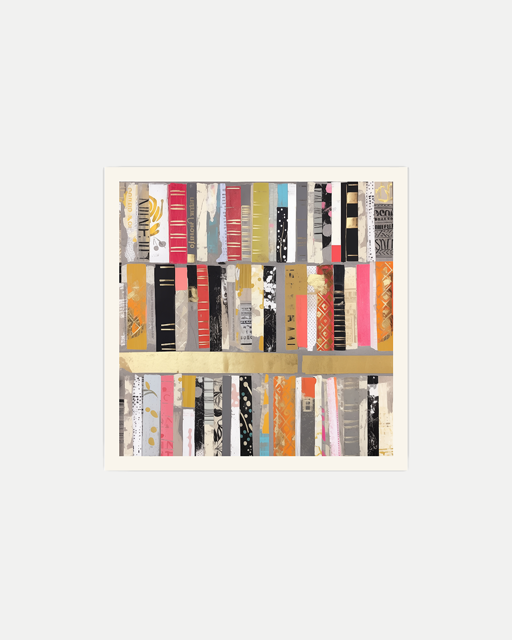 A mixed media design of a multicolored book shelf. This print has a white border which frames the design.