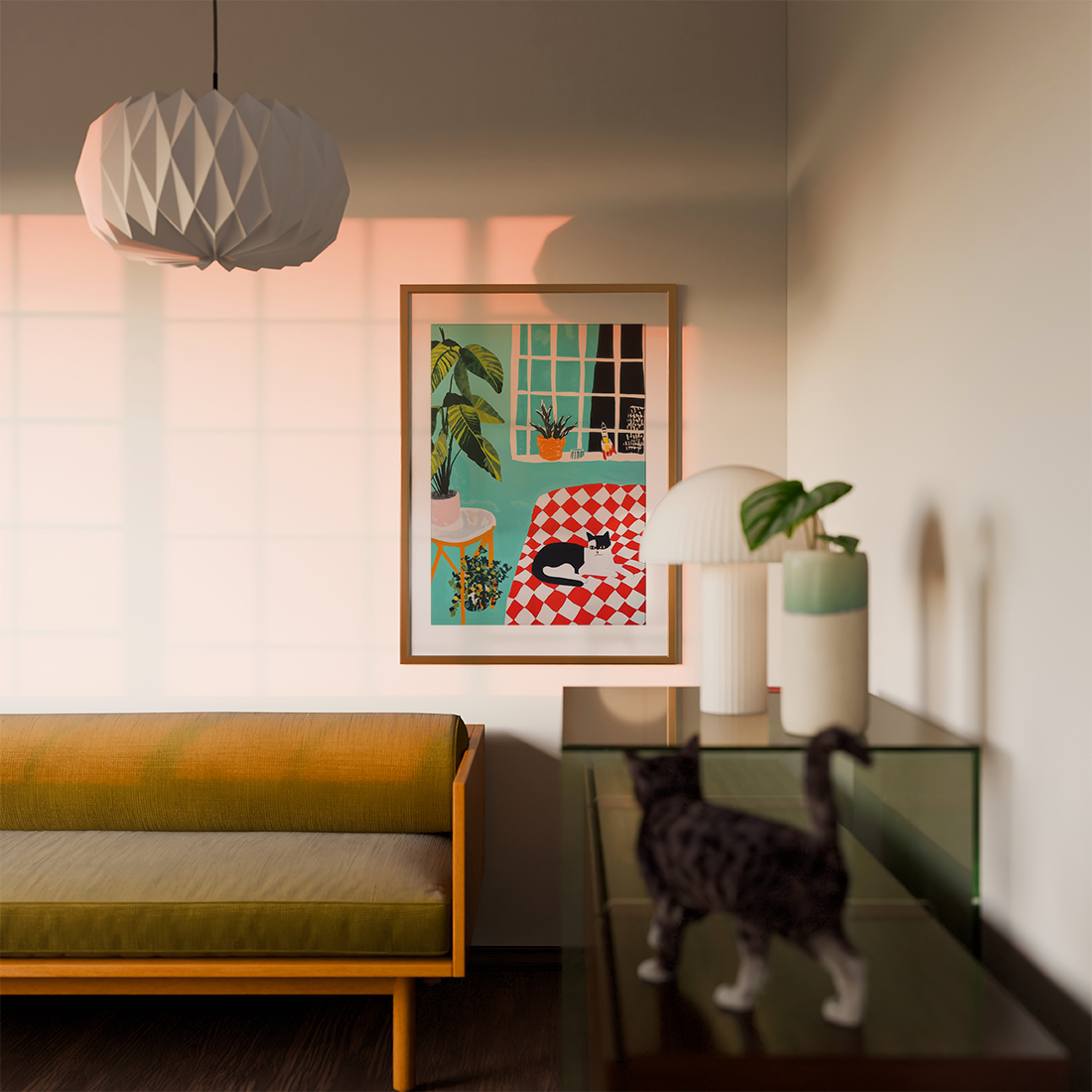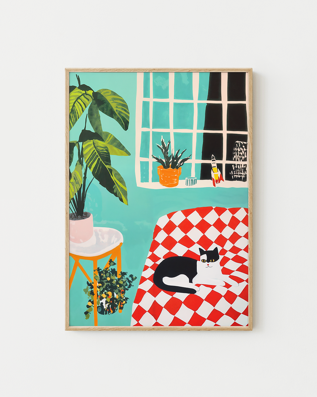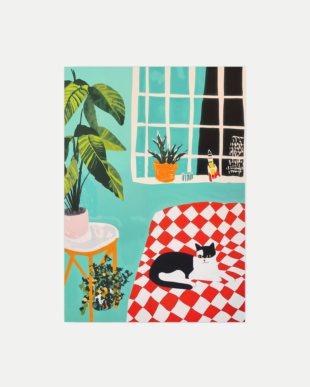 A painting illustration of a cat lying on a red checkered throw, in front of a light teal wall and a green plant