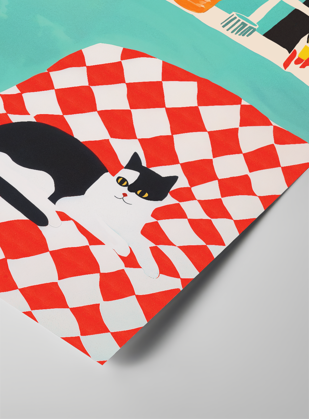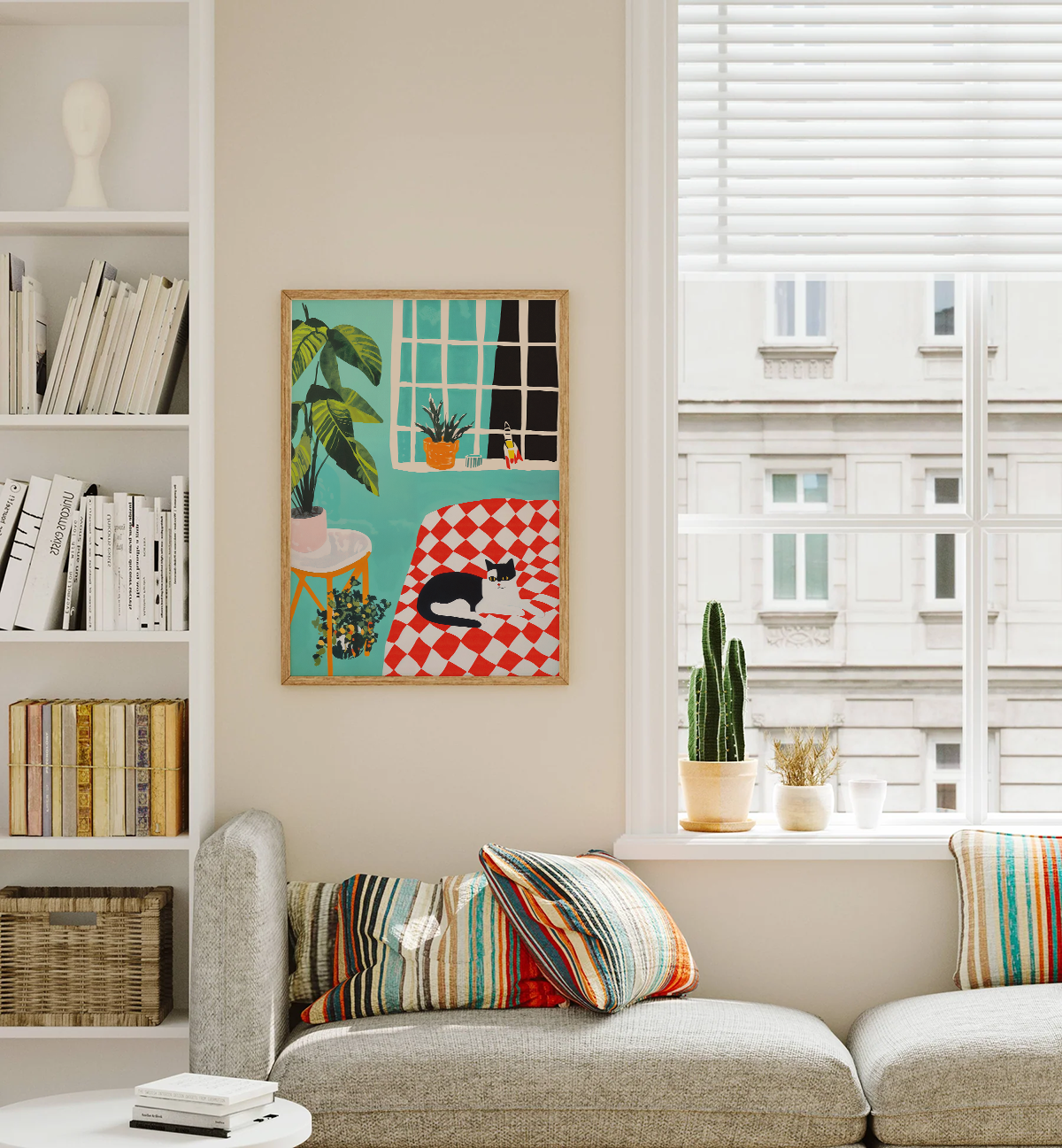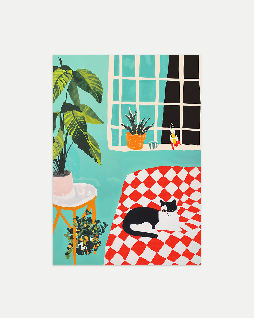 A painted illustration of a cat lying on a red checkered throw in front of a light teal wall and a green plant.