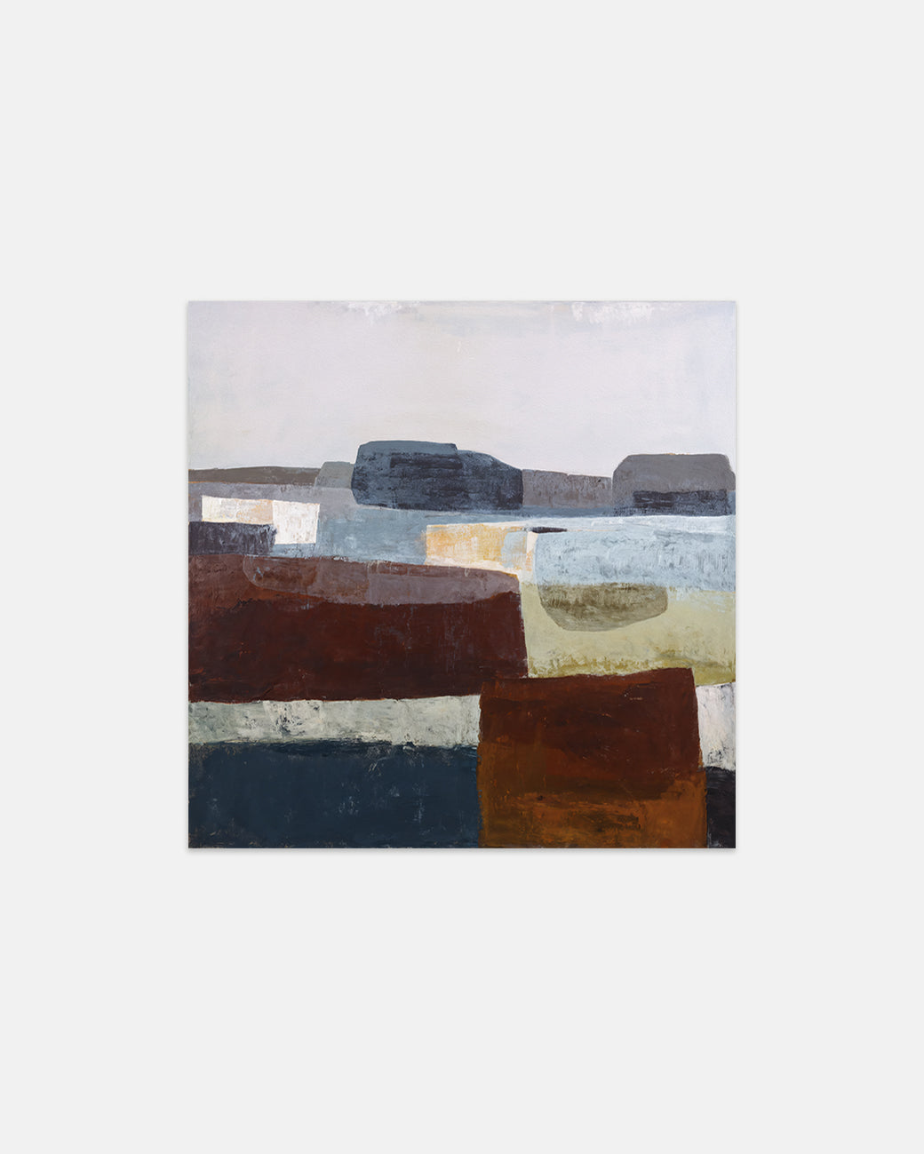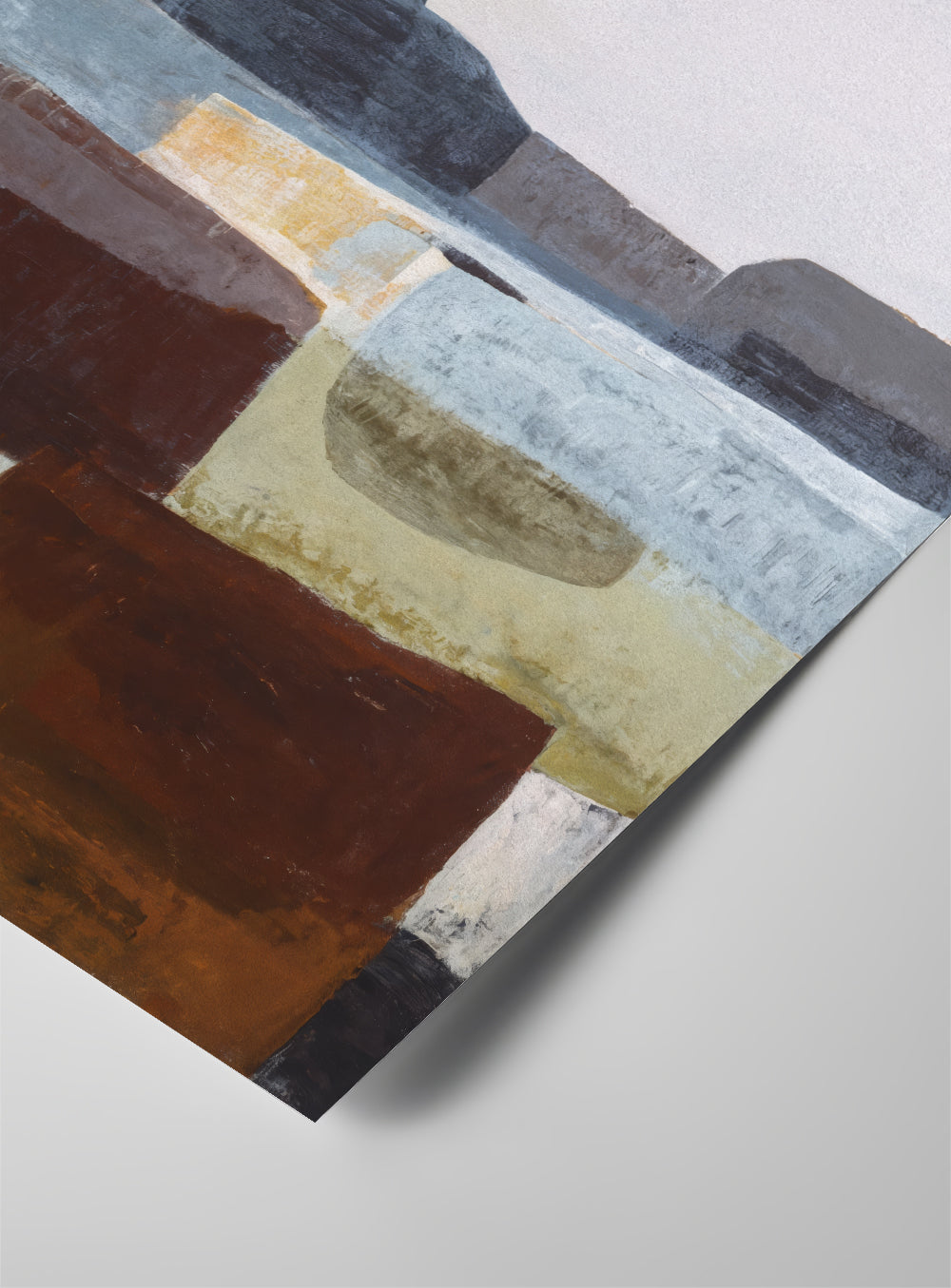 An abstract painting in earthy tones of Stone blue, grey, brown and pale green.