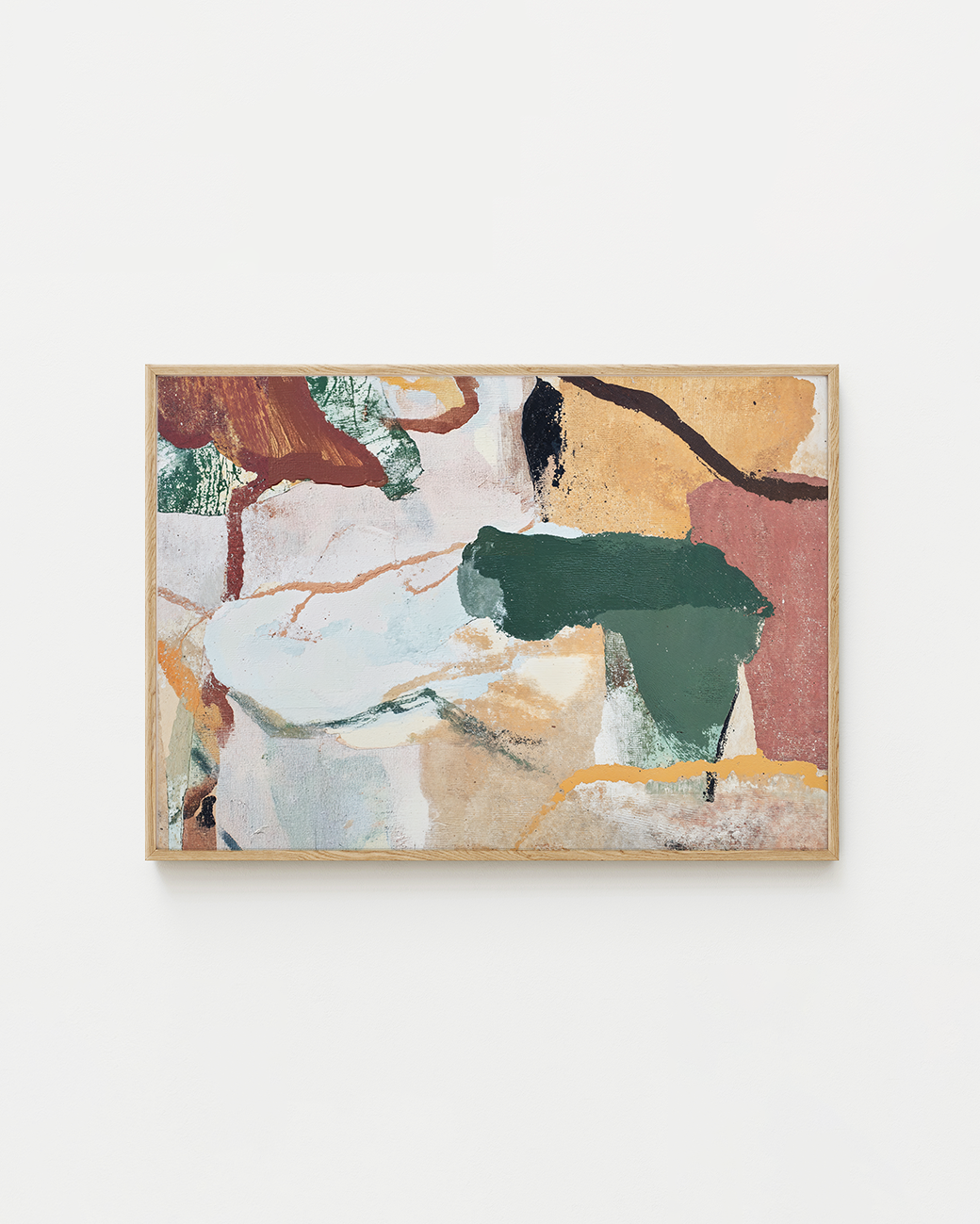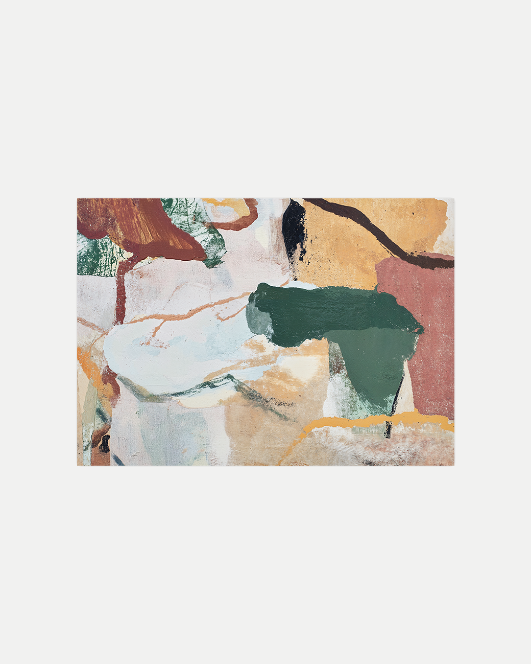 An expressive abstract painting with earthy colours of mineral green, dusty rose, brown and fawn.