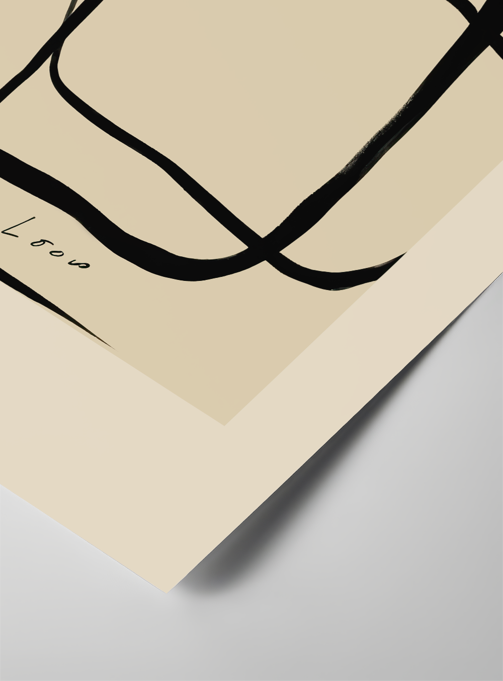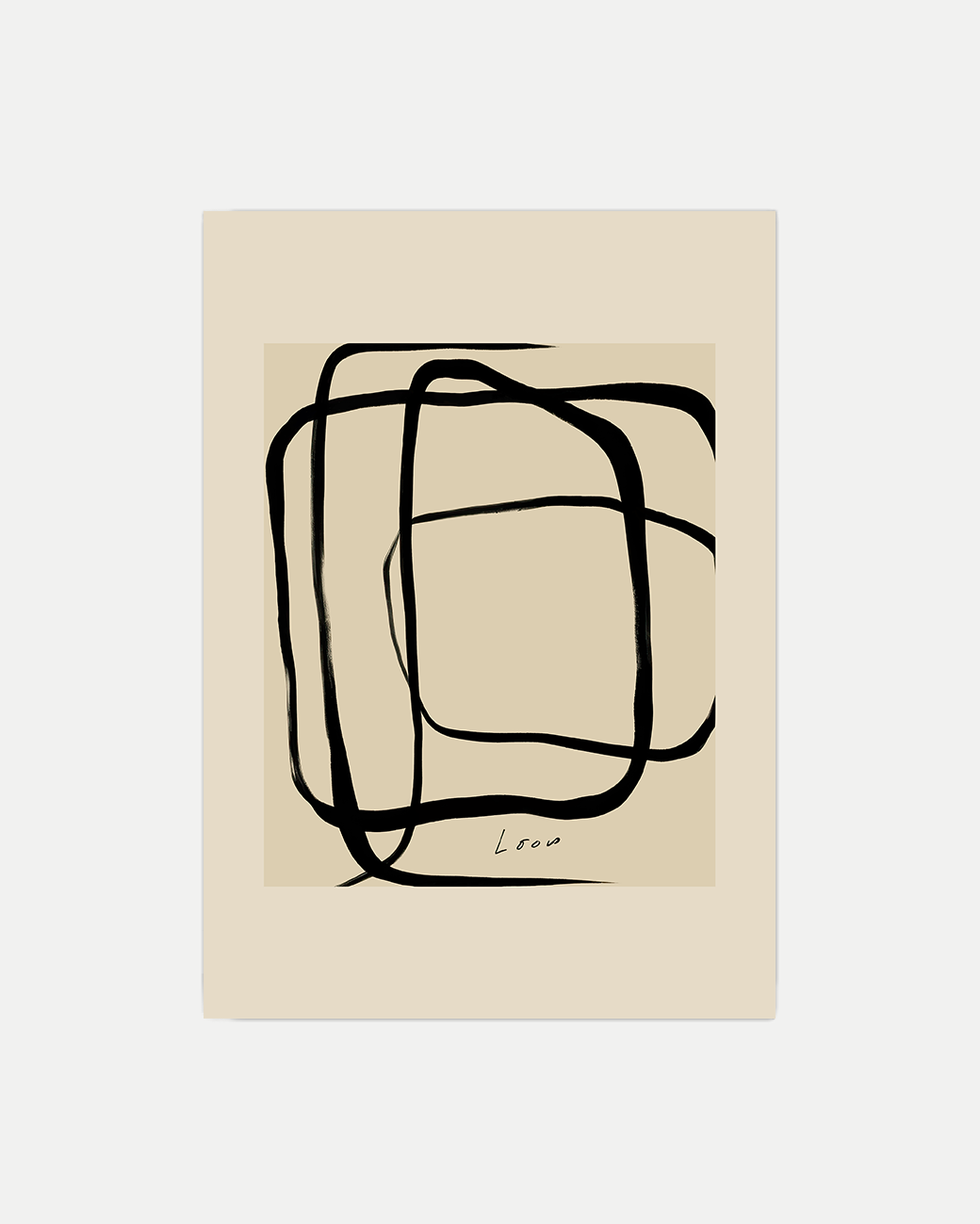 An abstract painting of a black looping line. The painting has a beige border around it which frames the design.