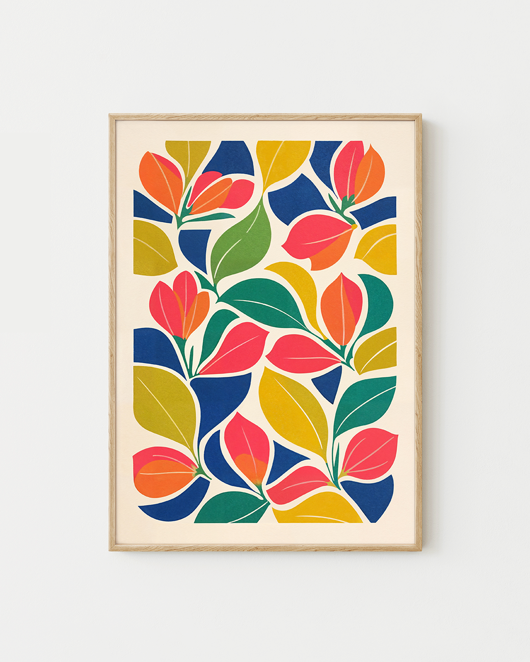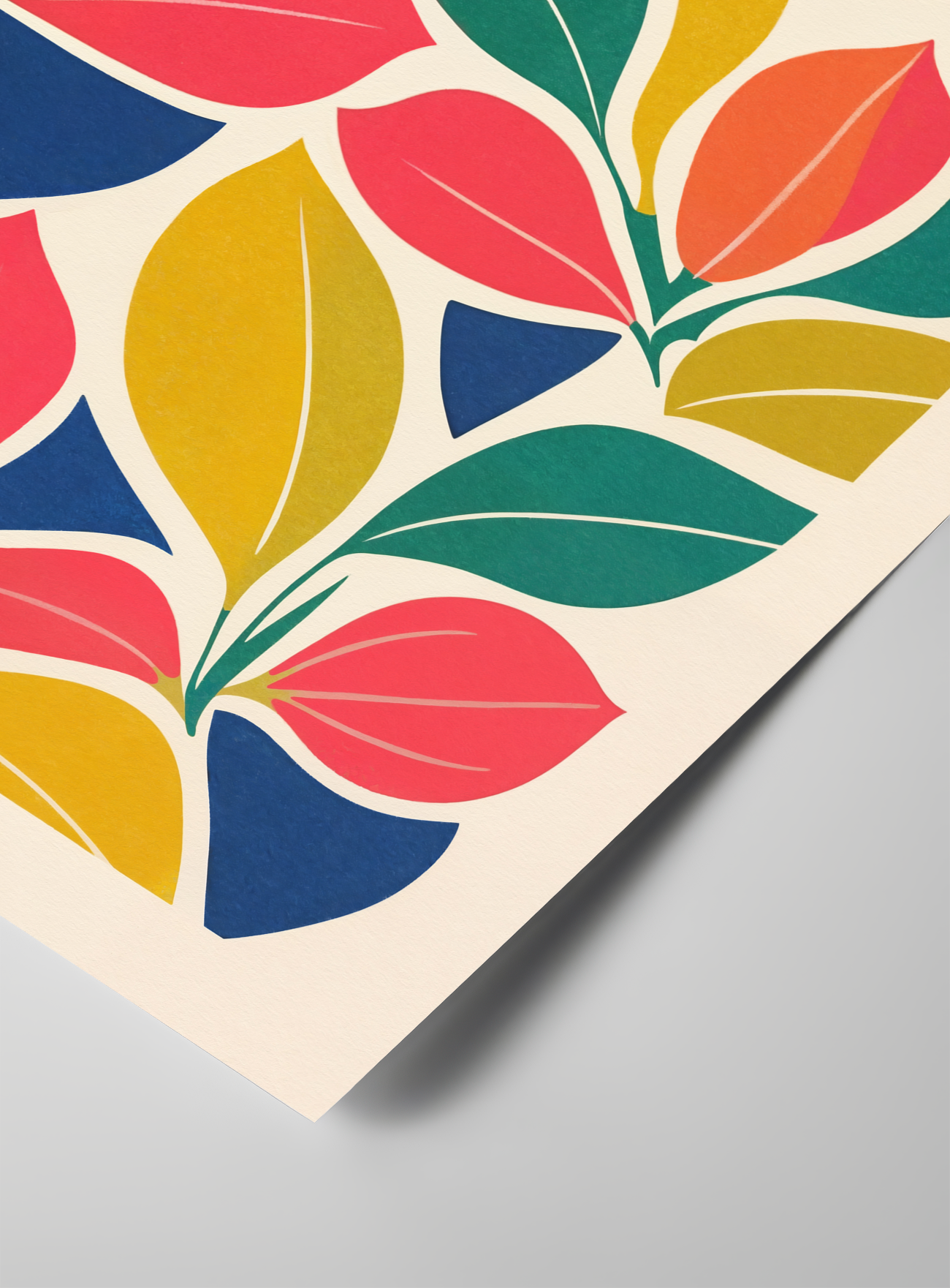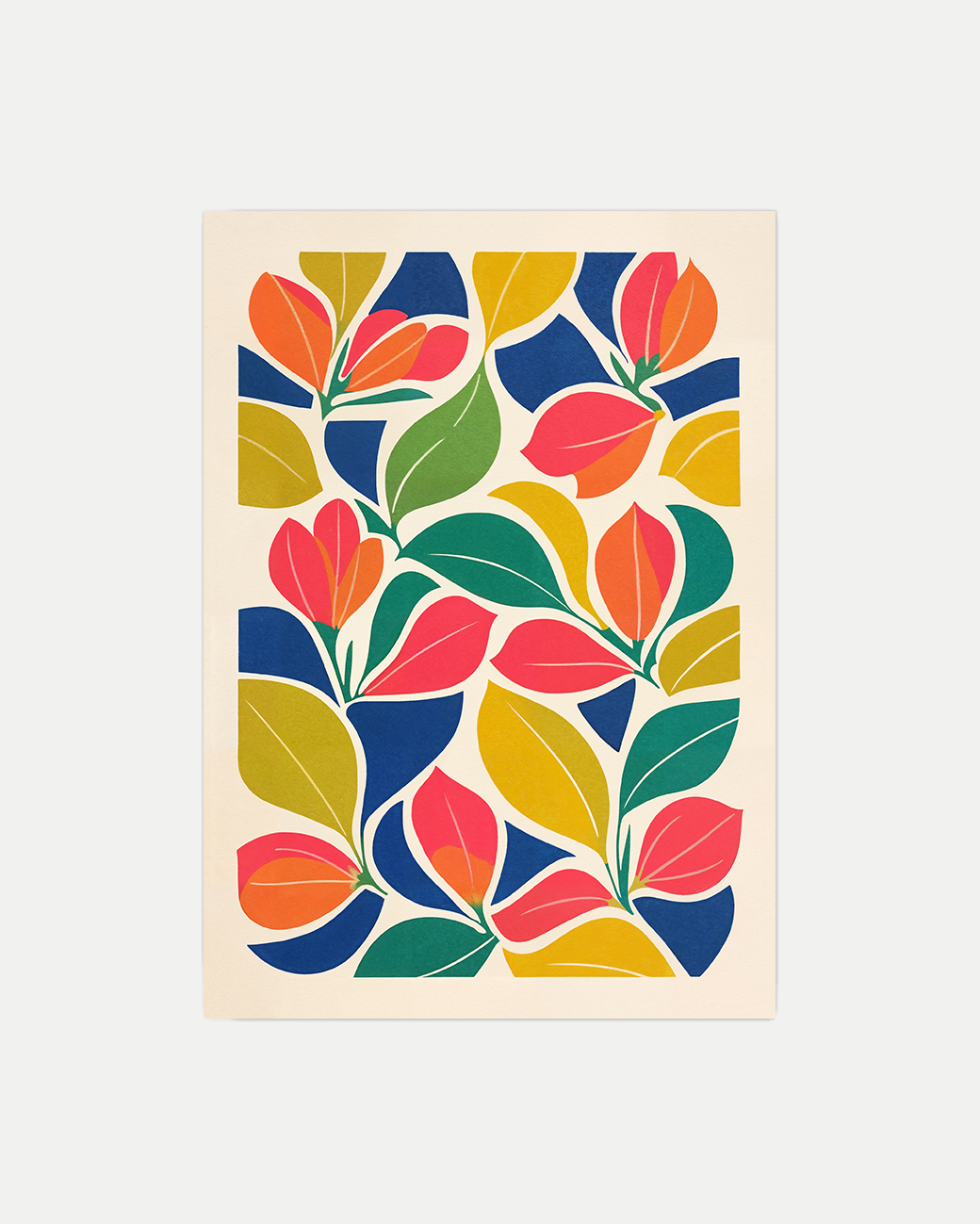An abstract multicolored illustration of petals. The illustration has a beige border around it which frames the design.