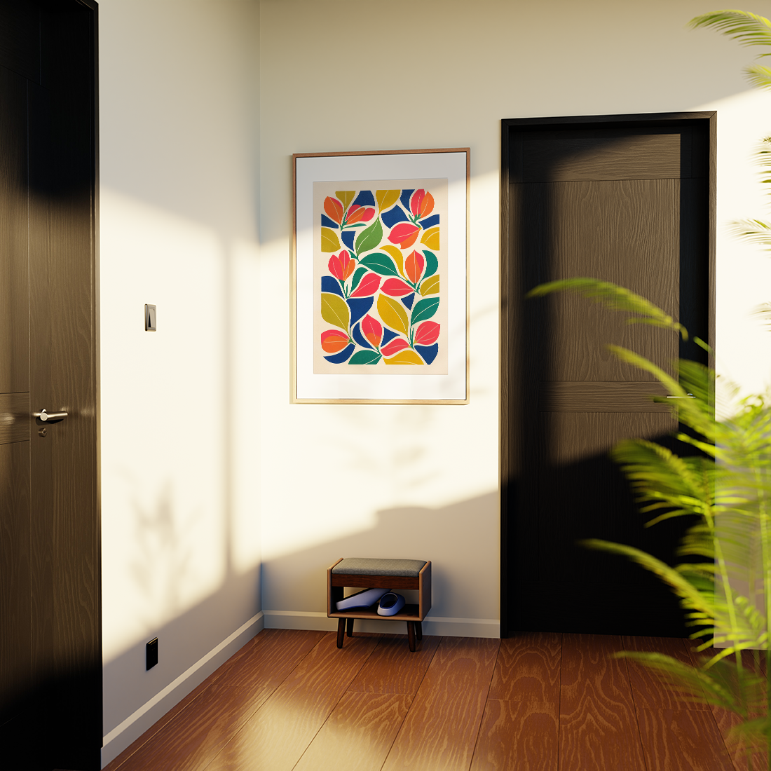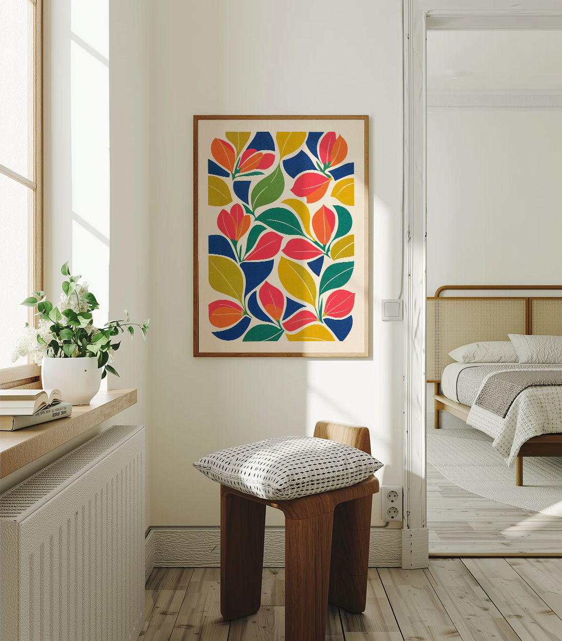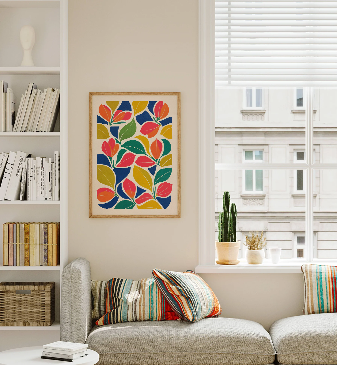 An abstract multicolored illustration of petals. The illustration has a beige border around it which frames the design.