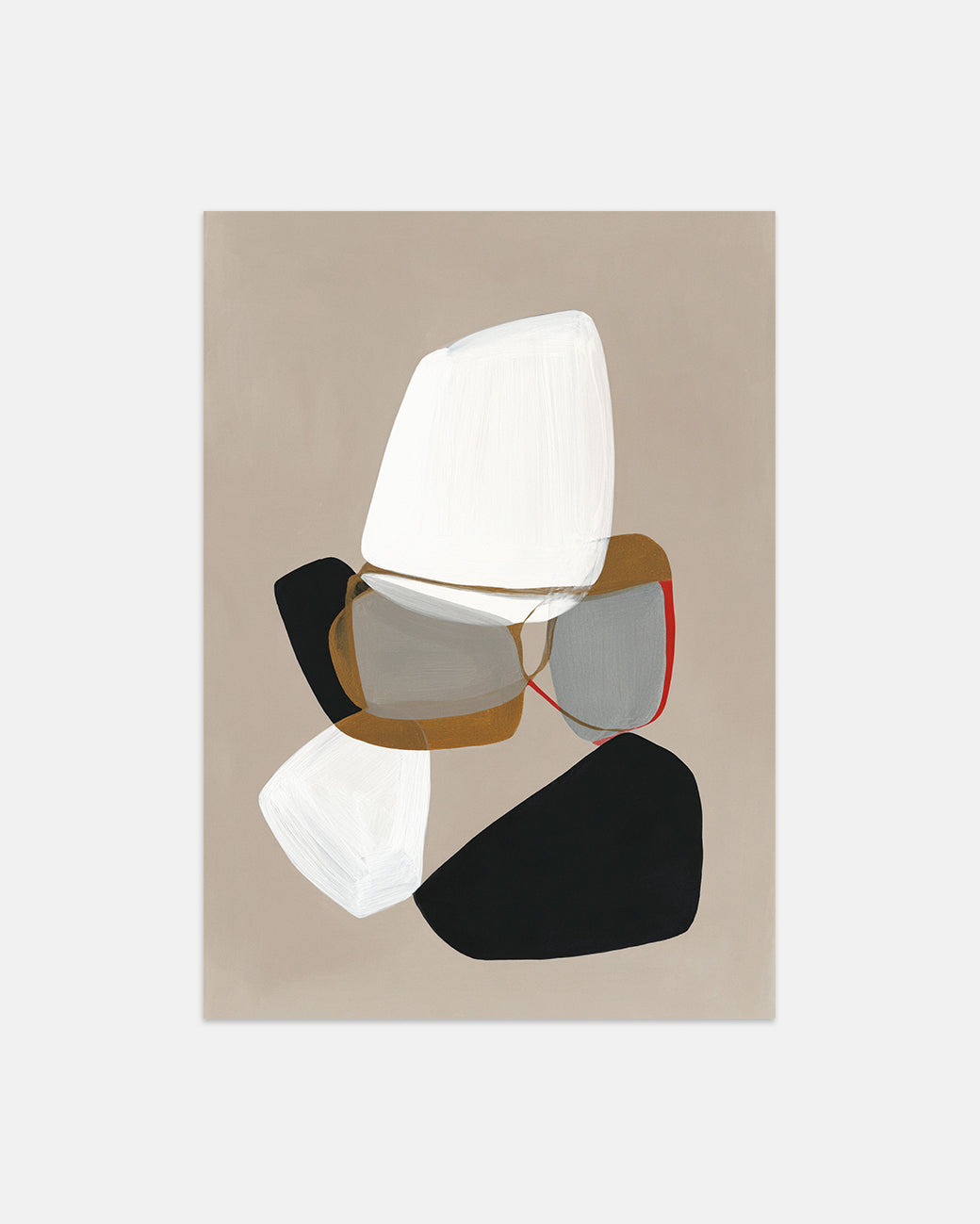 An abstract painting of brown, white, and black forms, accented with a subtle hint of red, set against a warm brown-beige ground.
