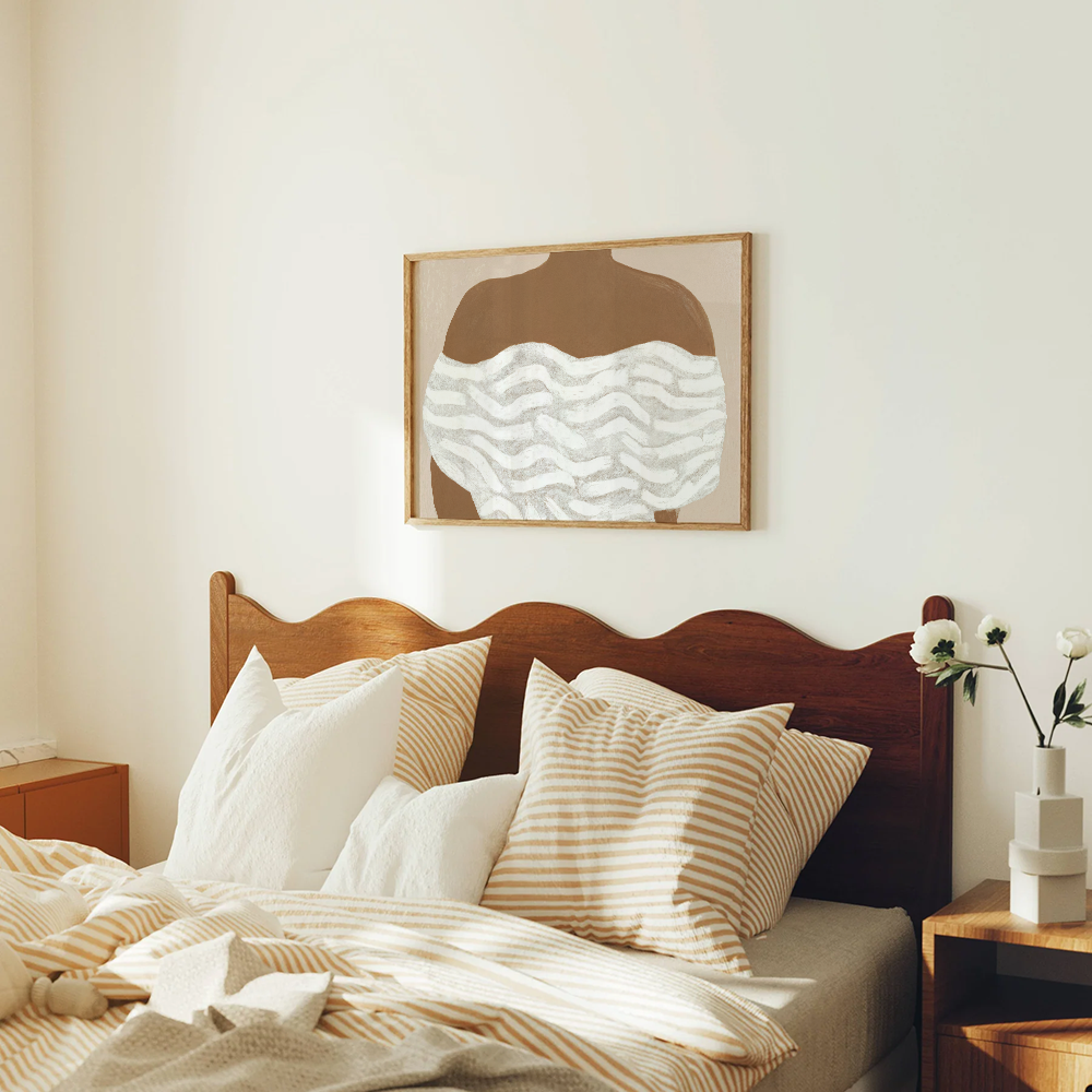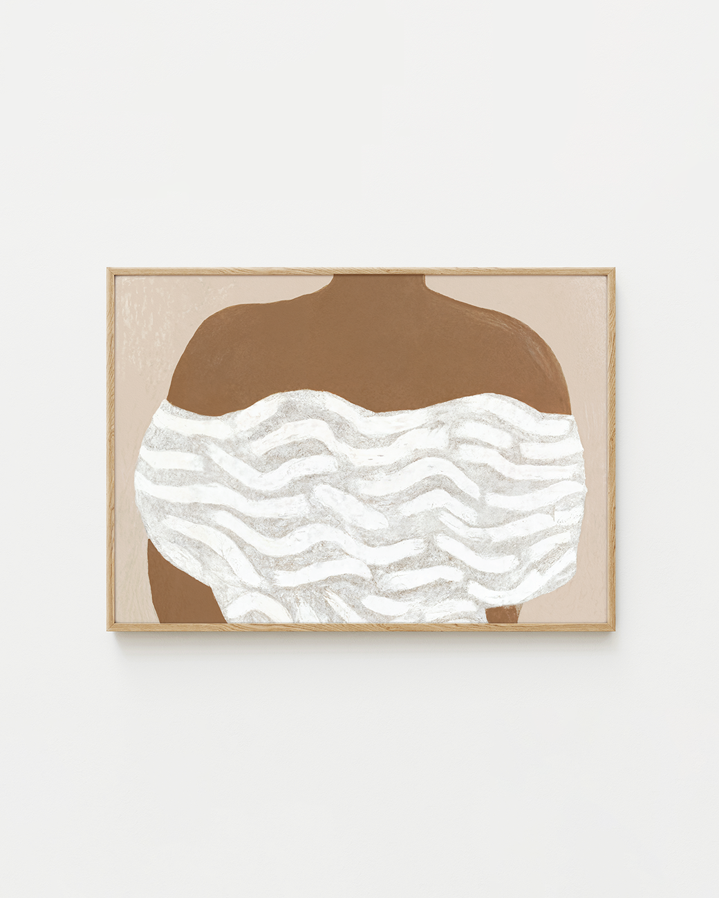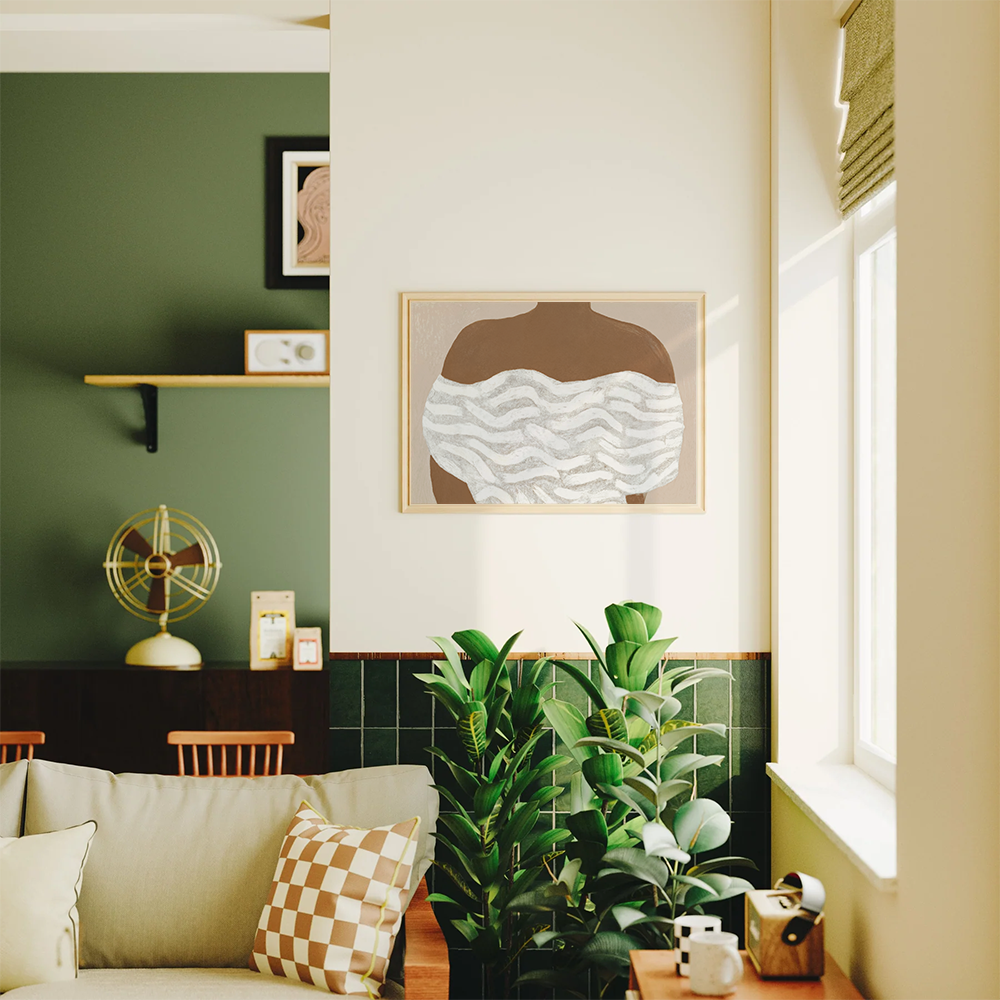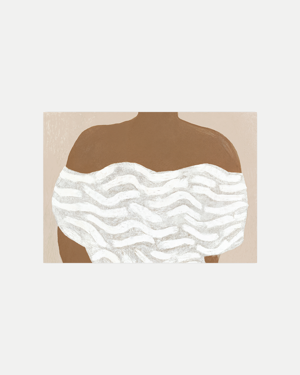 A calming closeup portrait of a woman in a white patterned drop-shoulder dress, set against a beige background. Soft, neutral tones bring quiet elegance to any space.