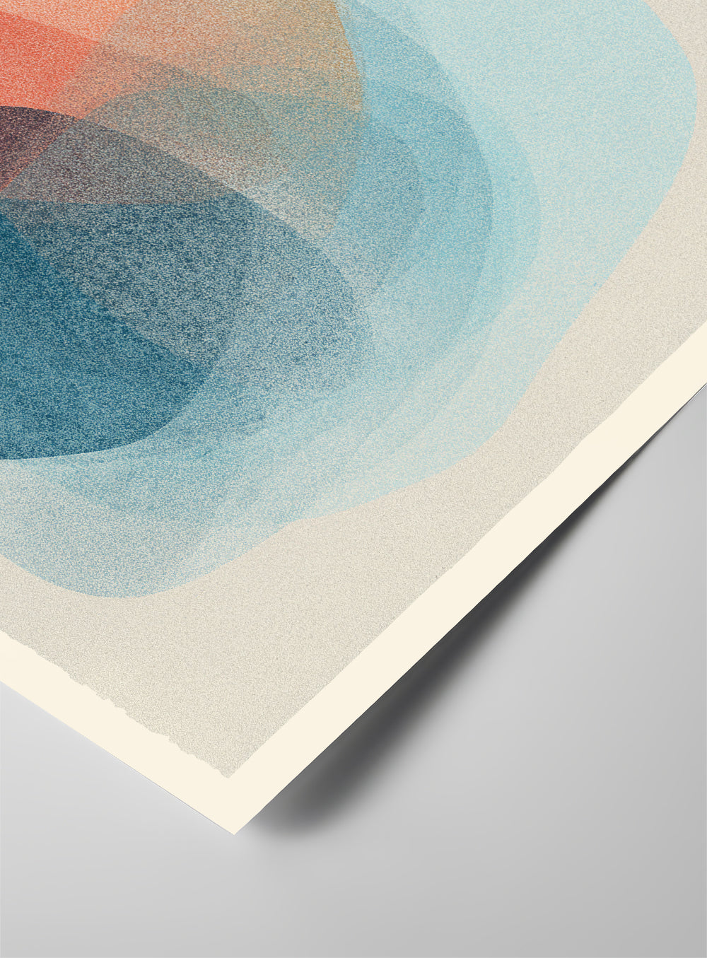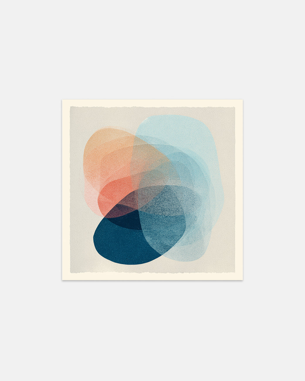 An abstract design built from layered risograph-style forms in shades of blue and orange, featuring subtle overlaps, texture, and slight misregistration.
