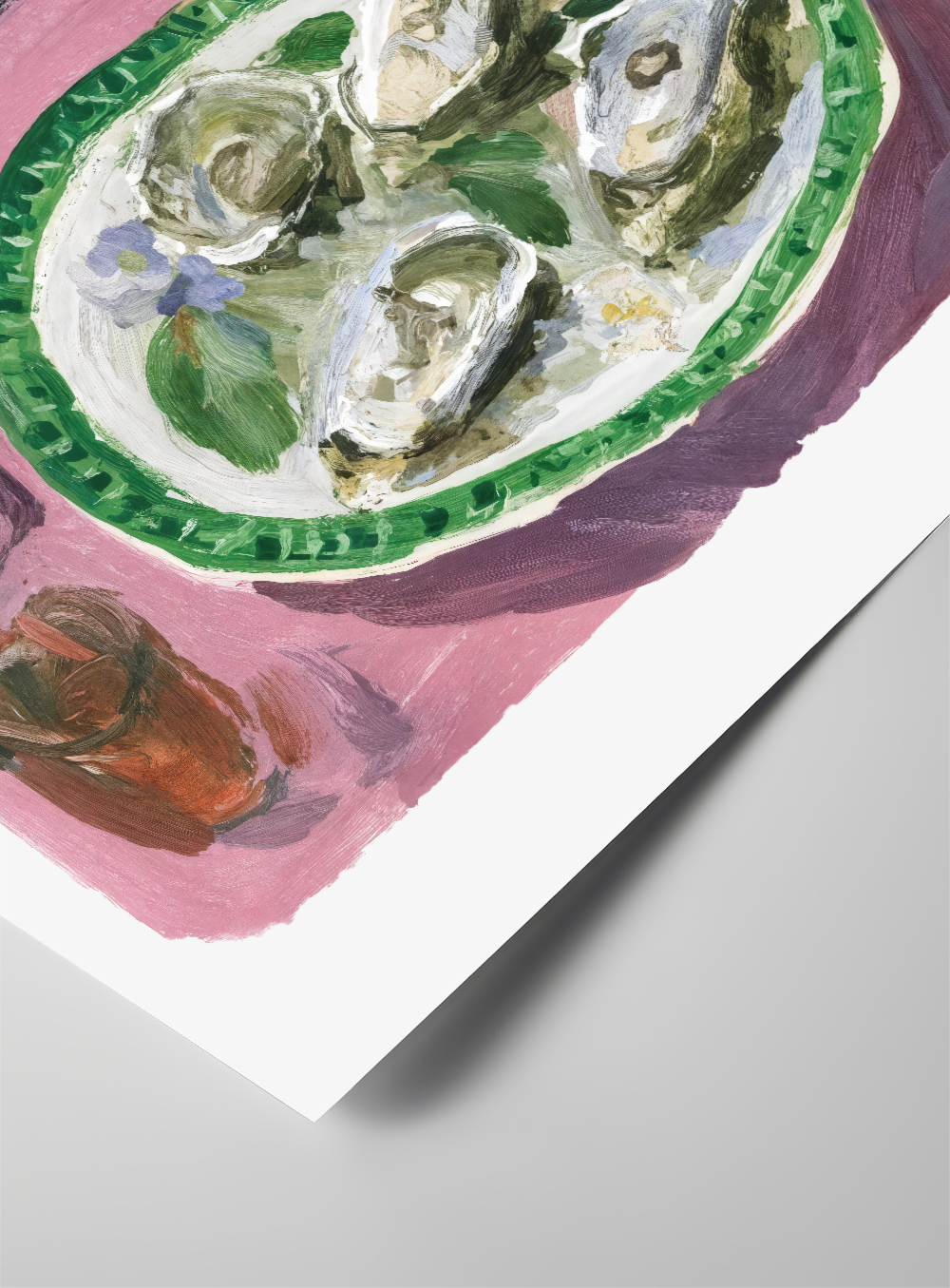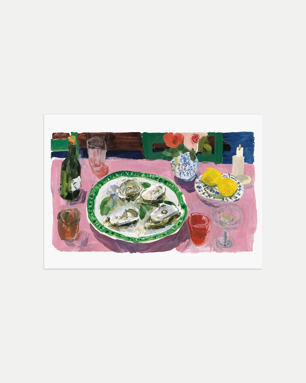 A painting of a vibrant pink dining table with a bowl of oysters and a zesty lemon plate. Perfect for adding a splash of gastronomic personality to your kitchen walls.