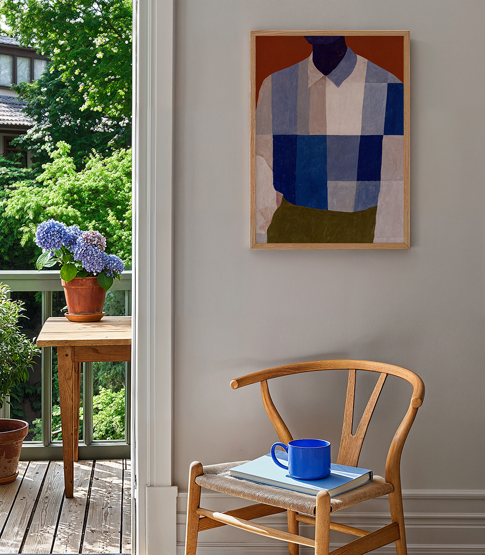 A figurative painting featuring a man in a patchwork shirt, executed in a warm refined palette of navy, copper red, and olive.