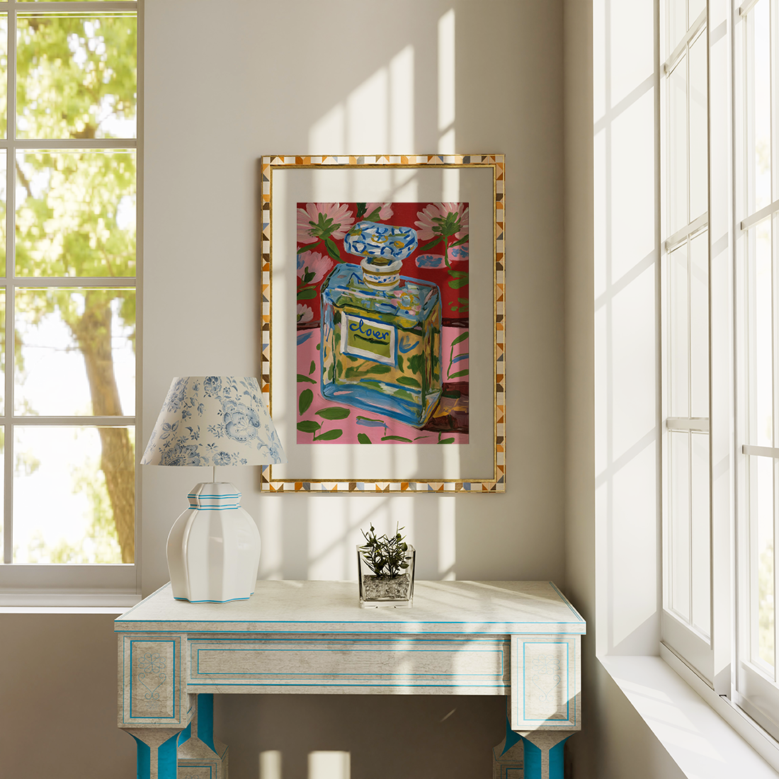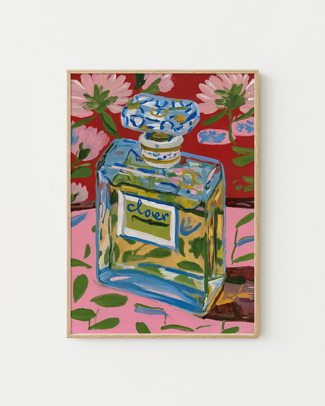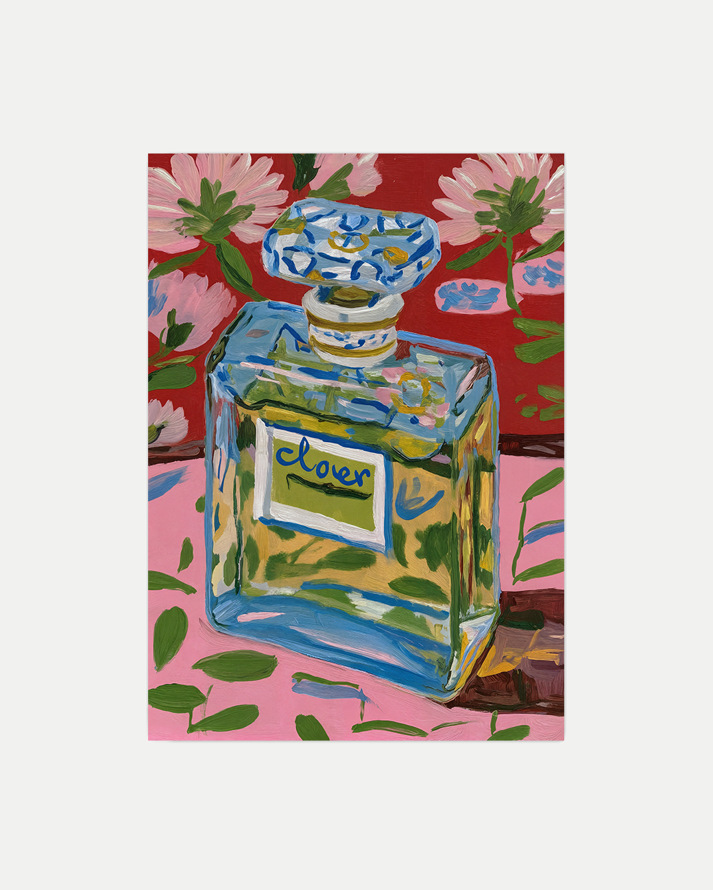 A bold painting of a perfume bottle stood on a pink surface in front of a red and pink floral backdrop.