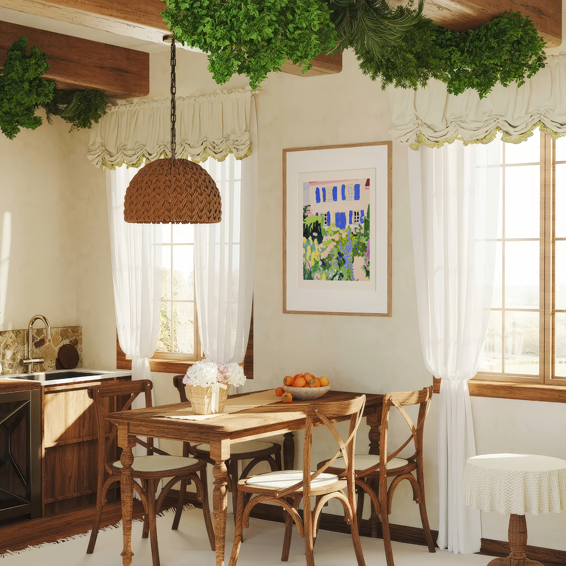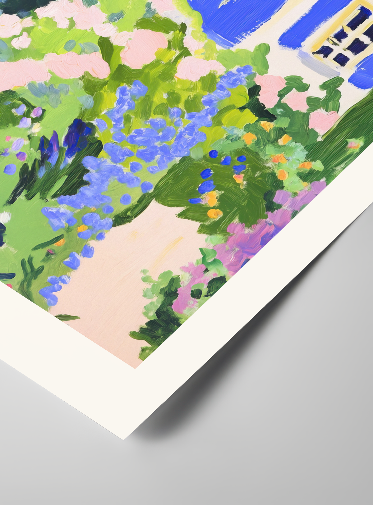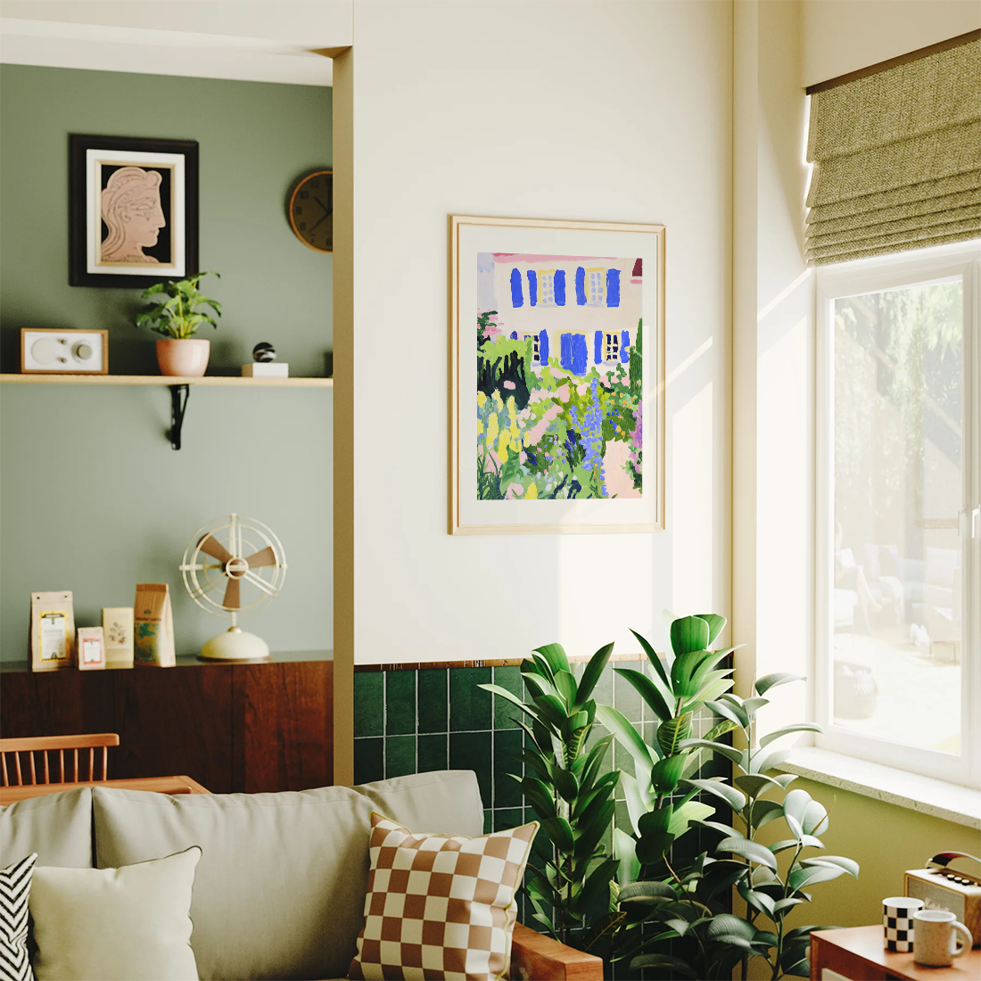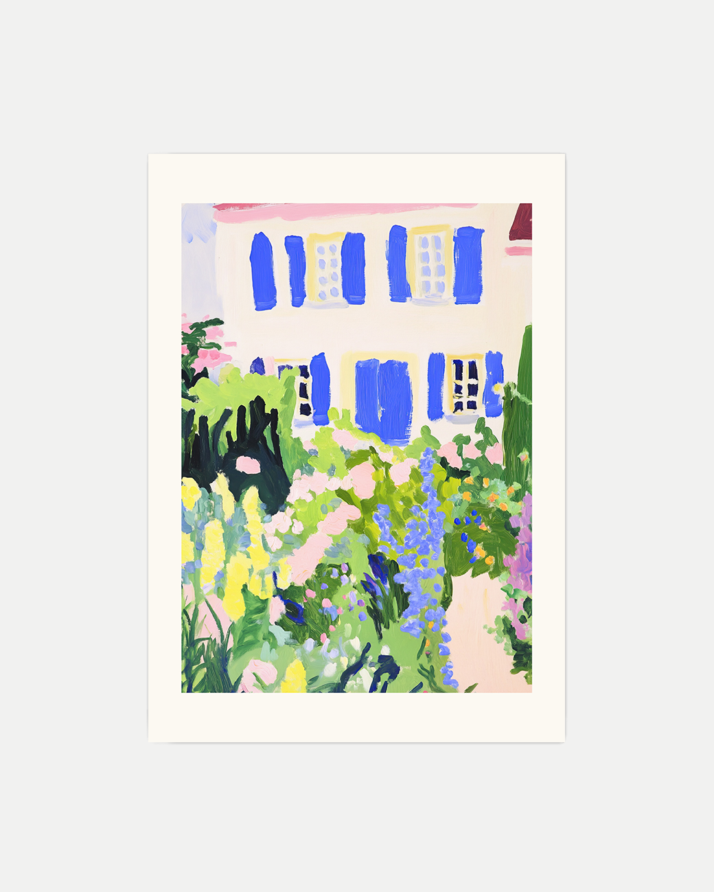 A painting of a villa in the summer with soft blue shutters and a vibrant garden with multiple shades of green. The painting has a white border around it which frames the design.