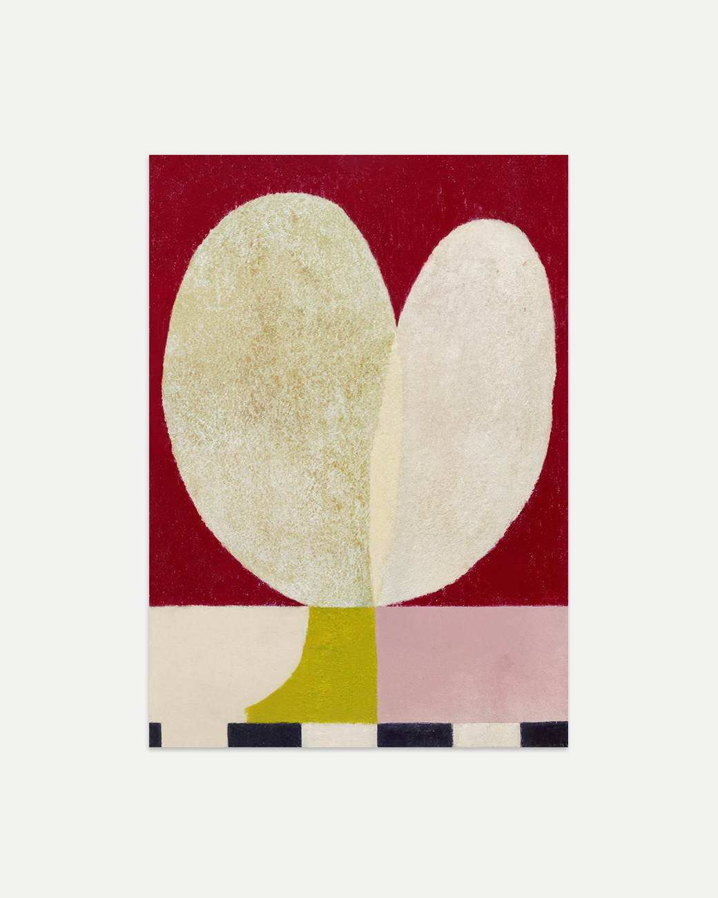 A painting of large white petals on a red and pink background, situated above a checkered panel.