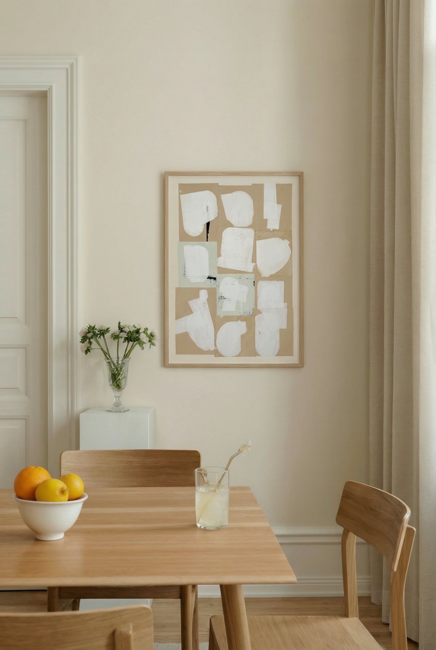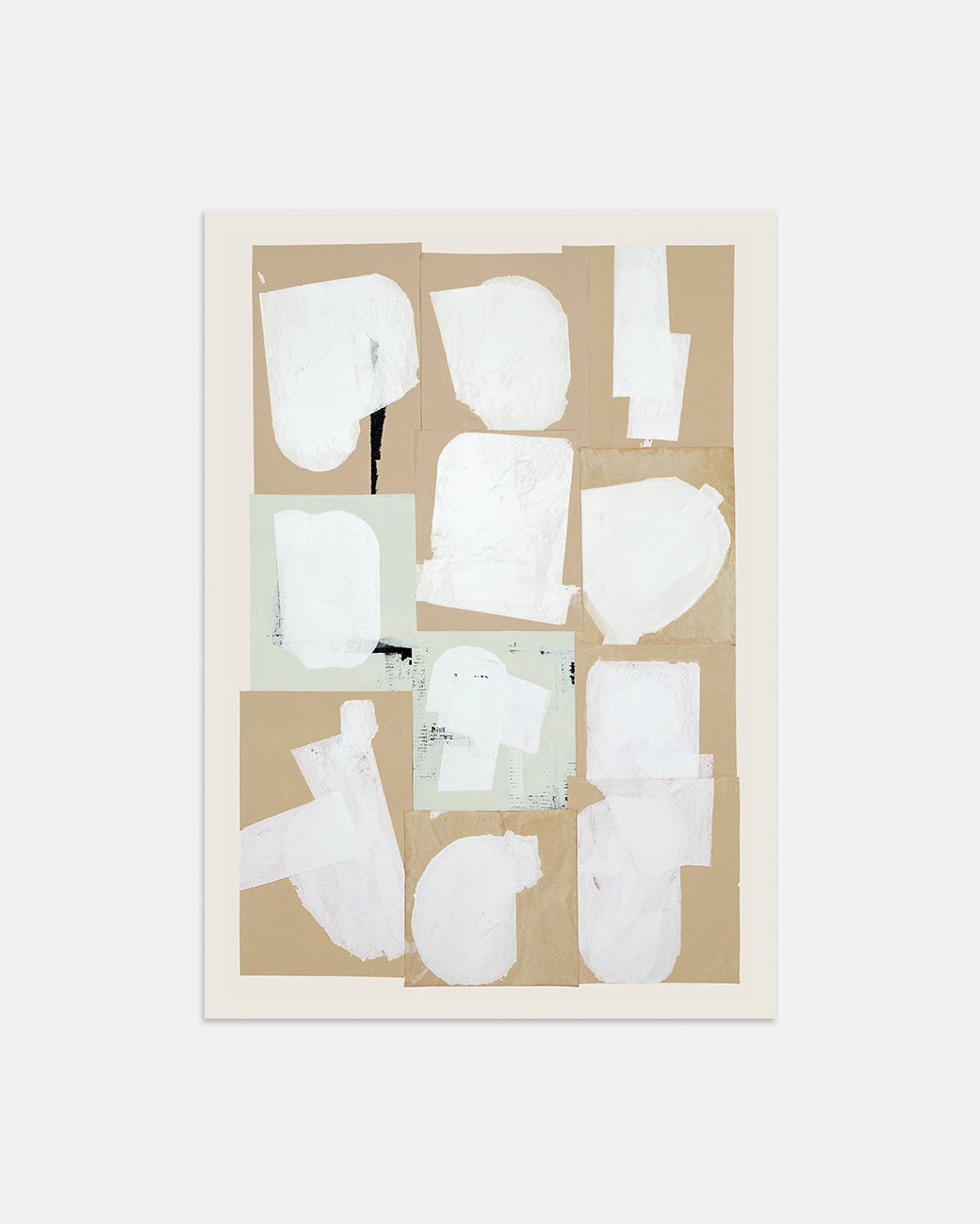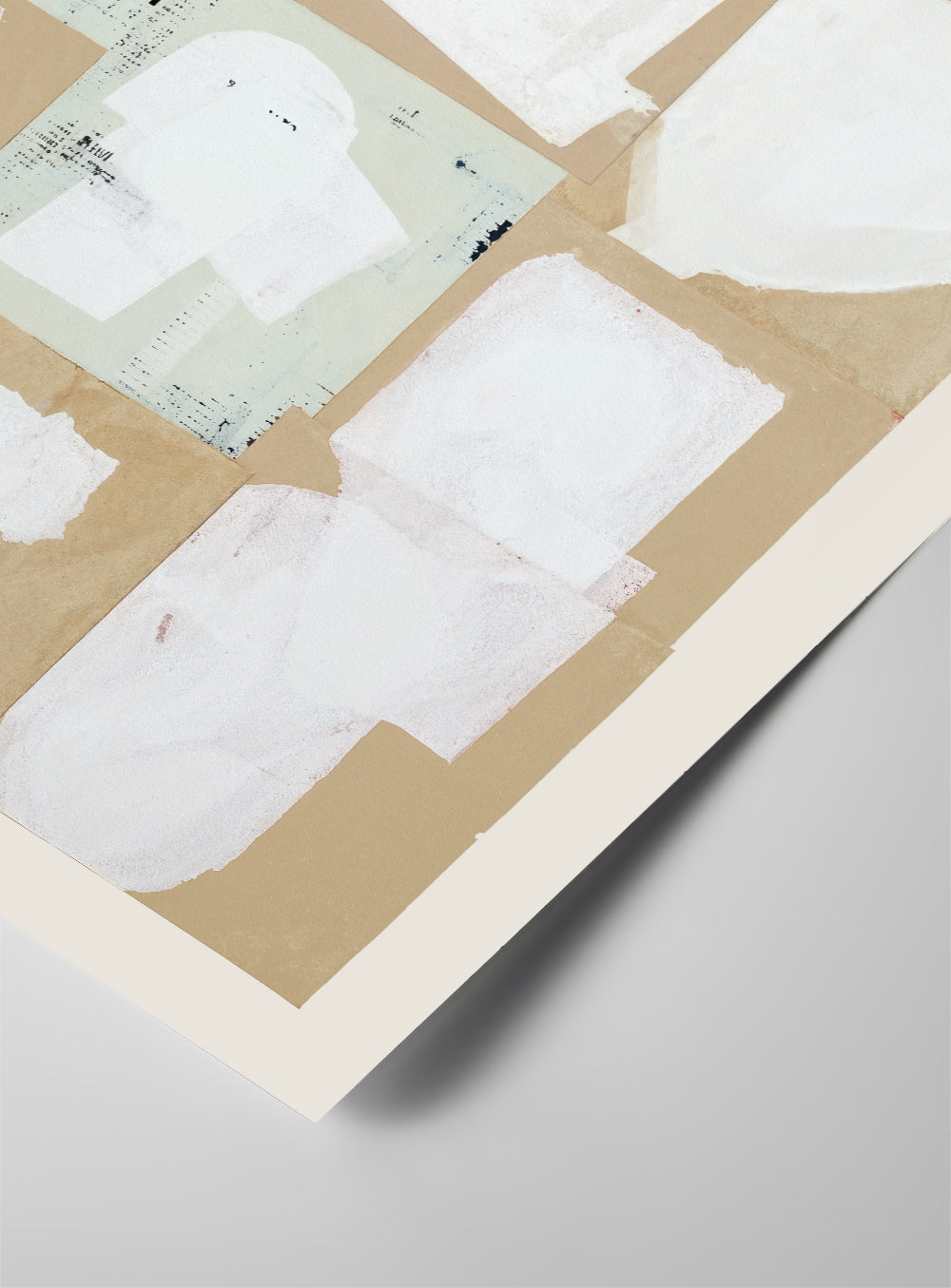 A minimalist abstract print featuring layered beige paper textures accented with soft white paint marks. Subtle, tactile, and modern—perfect for adding calm, understated depth to any space