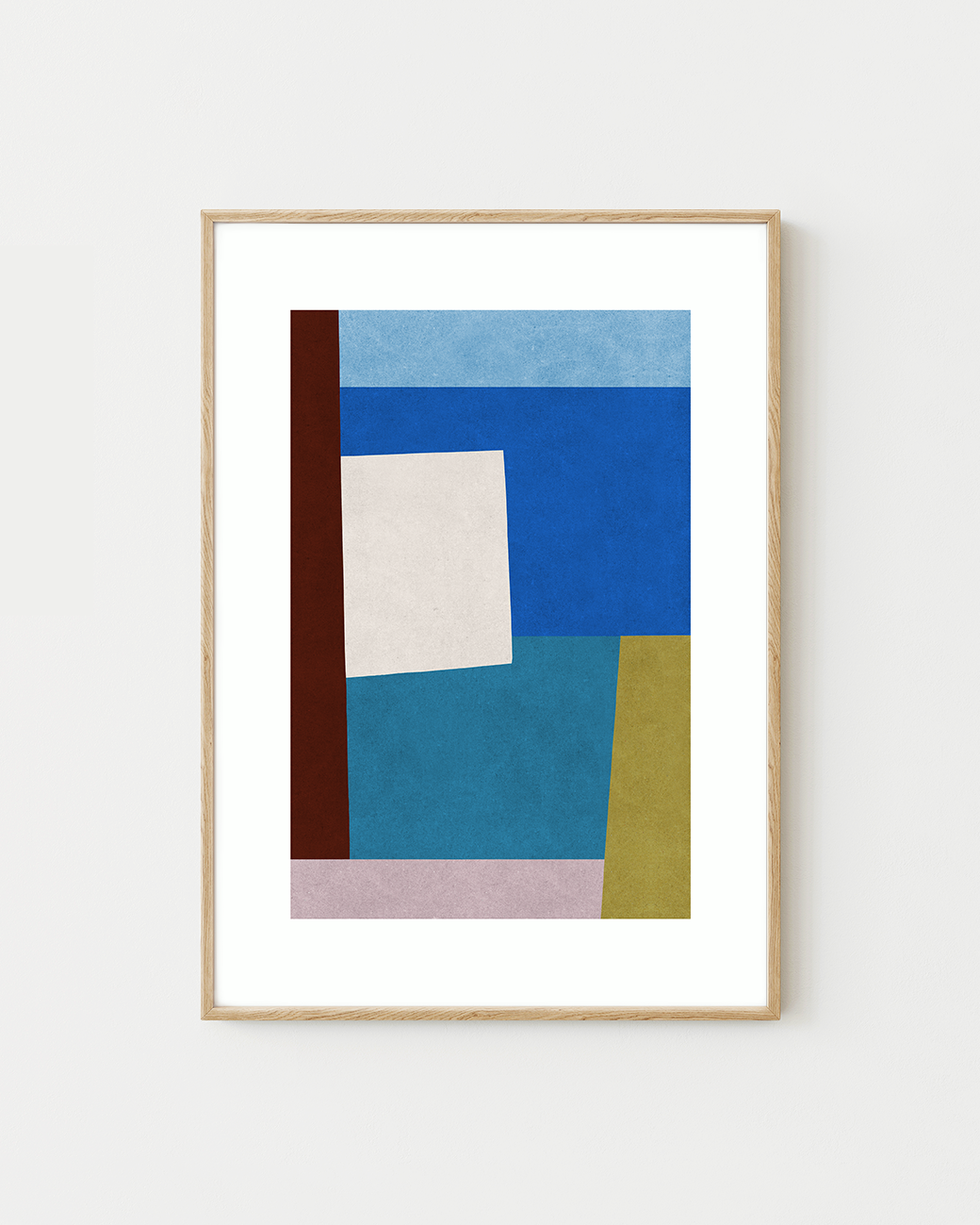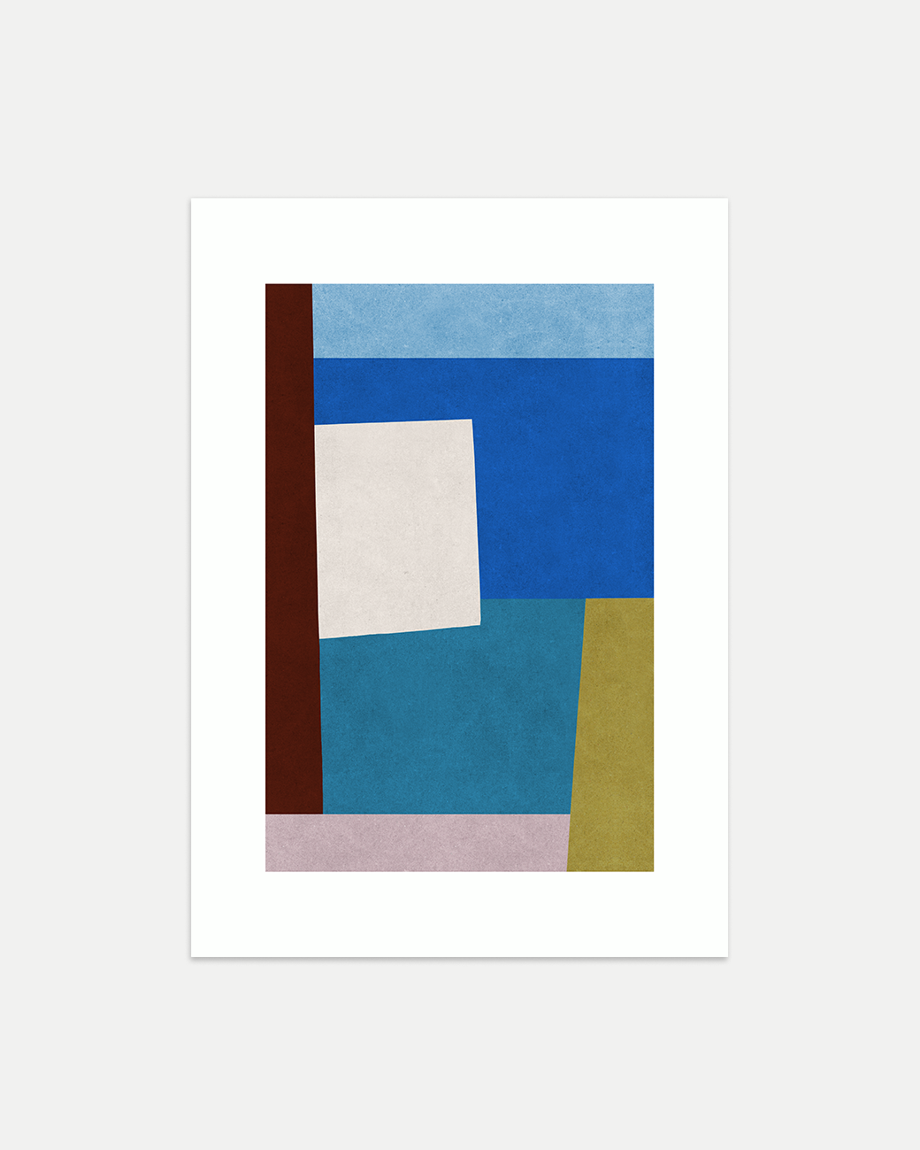 A structural mixed-media design with cerulean and light blue, teal, olive and burgundy.