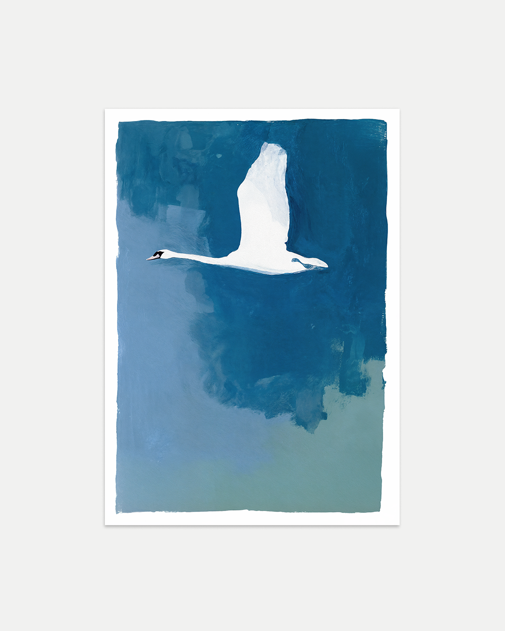 A painting of a white swan flying through the air on a deep sea blue and light teal background. There is a white border which frames the design.