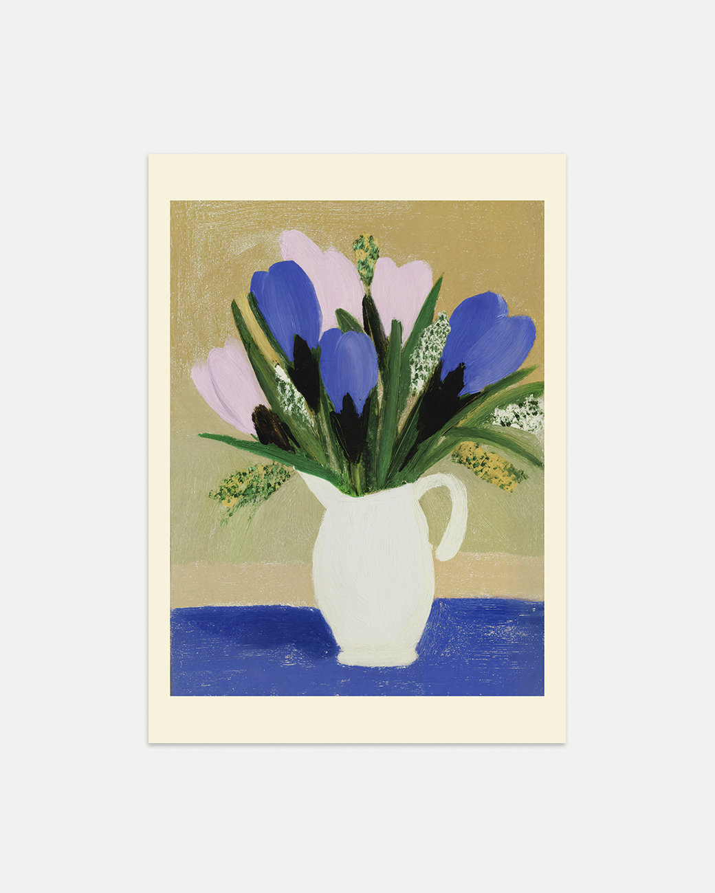 A painting of purple flowers in a white vase in front of a sand yellow wall.