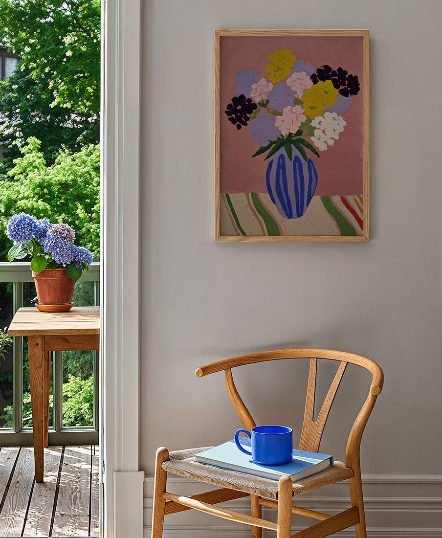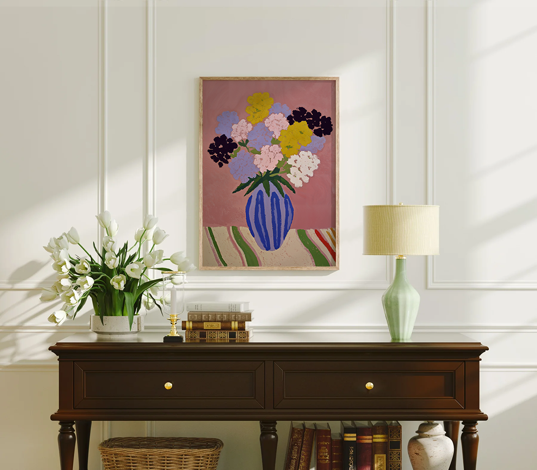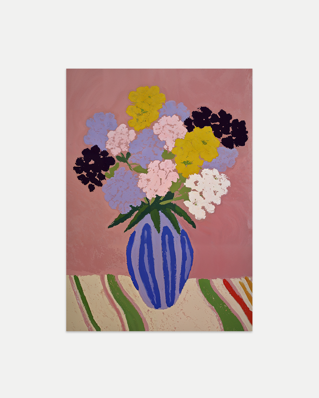 A painting of flowers in a purple striped vase in front of a rose gold wall.
