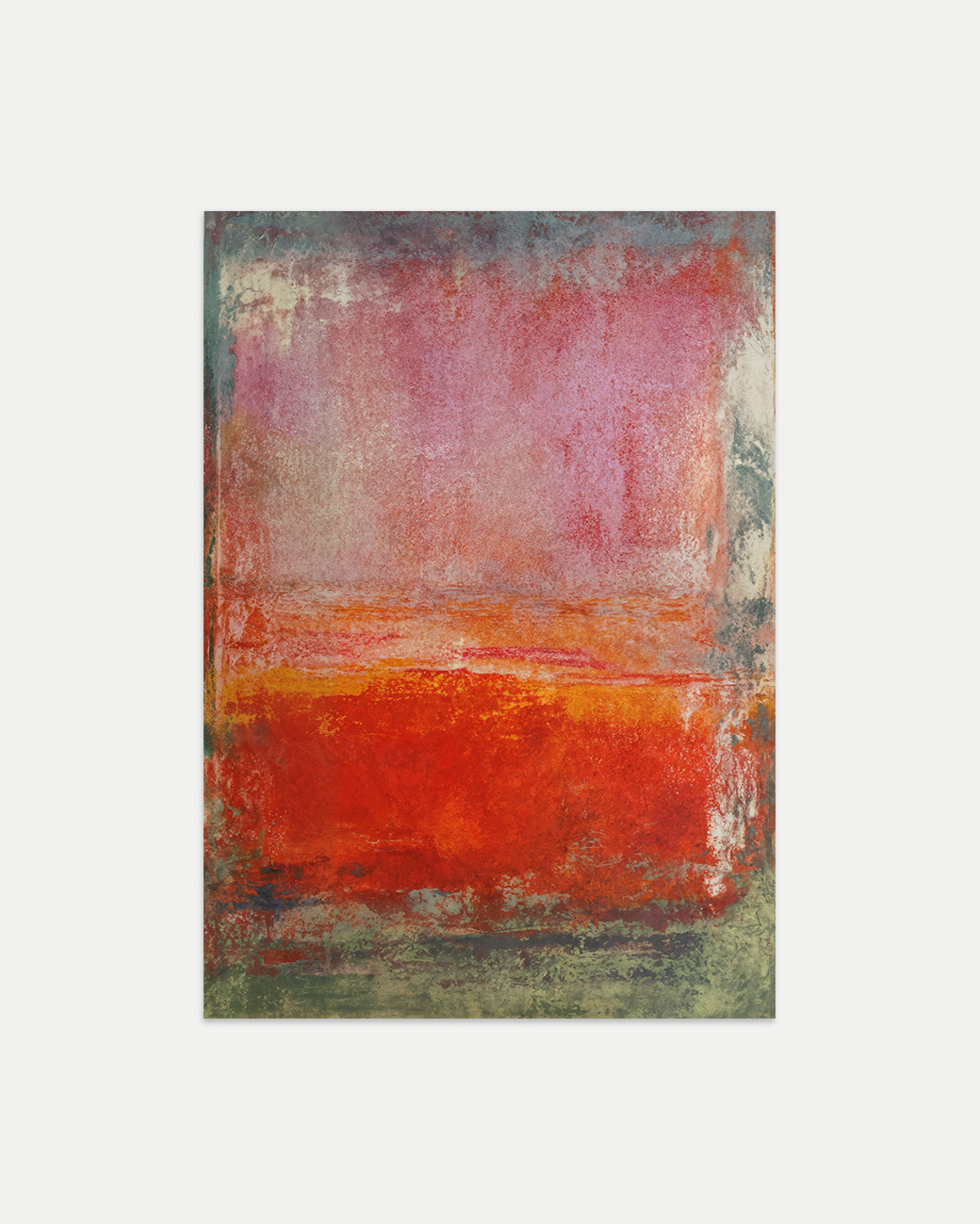 An abstract painting in a corrosion-inspired style, featuring red and washed orange and red tones. A white border neatly frames the painting.