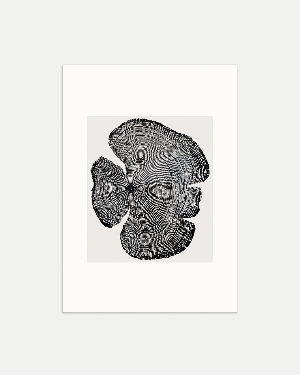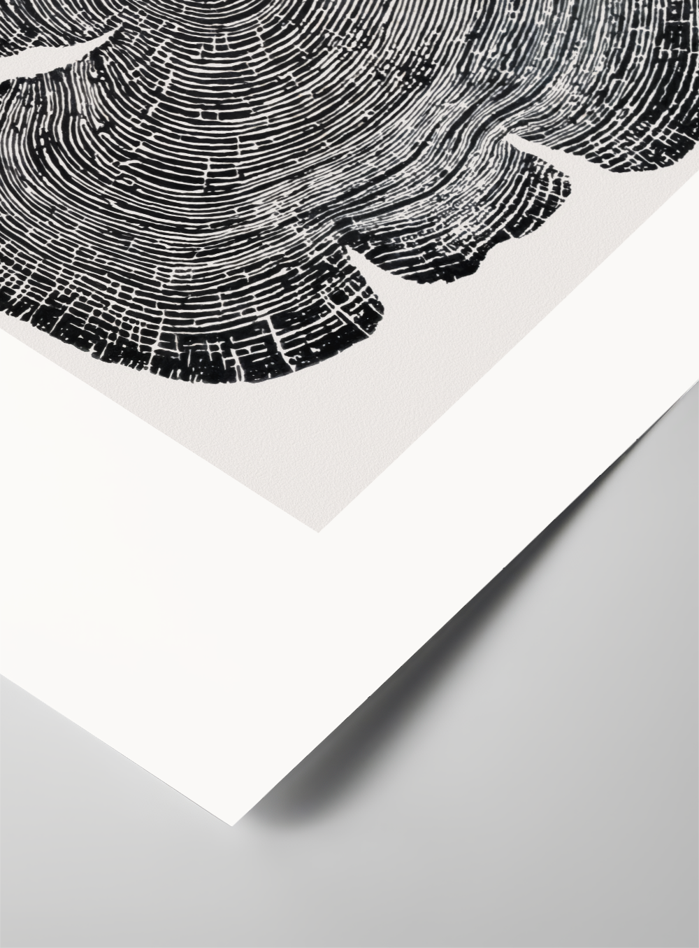 An abstract monochrome painted illustration, inspired by the cross section of a tree.