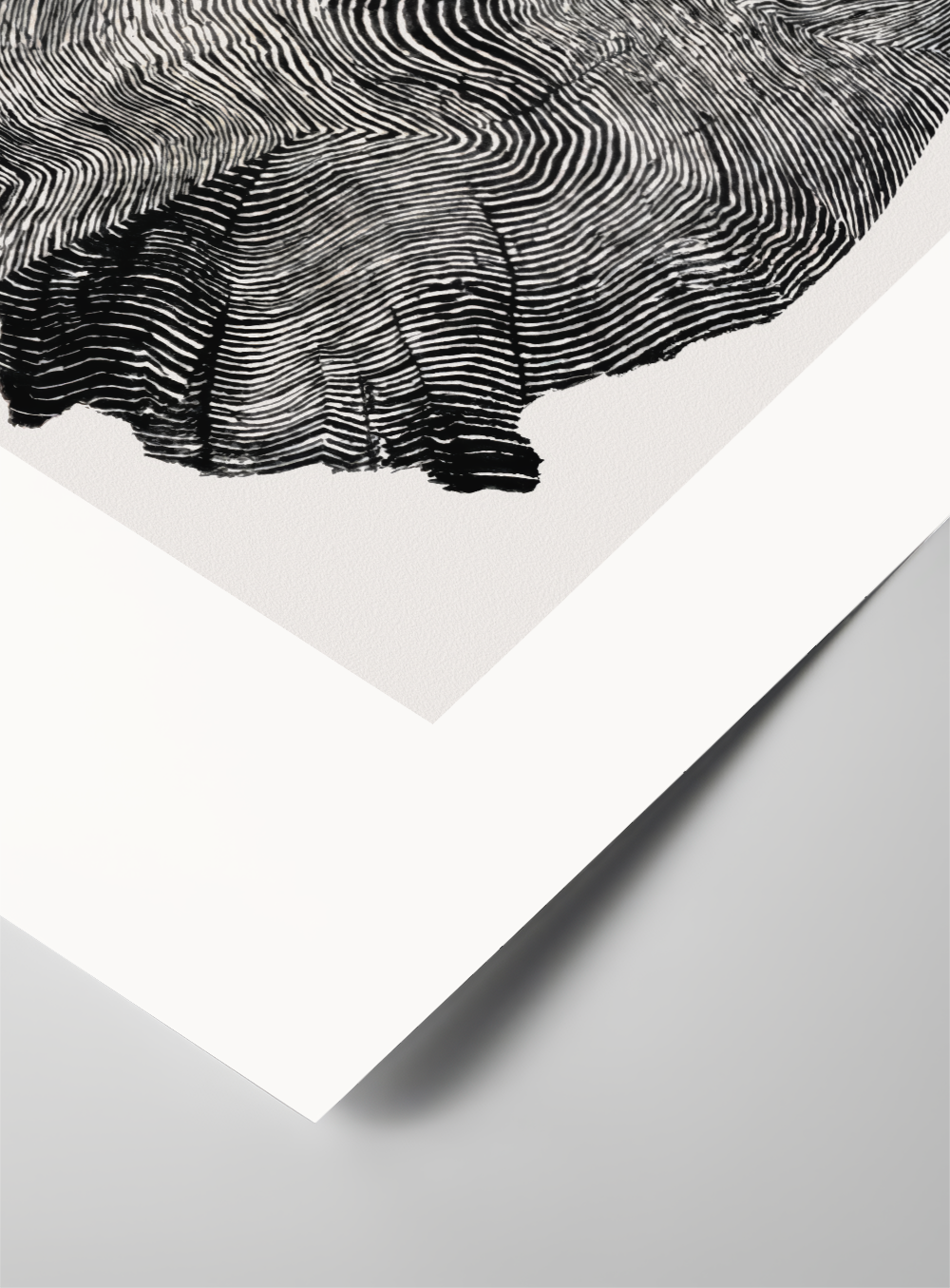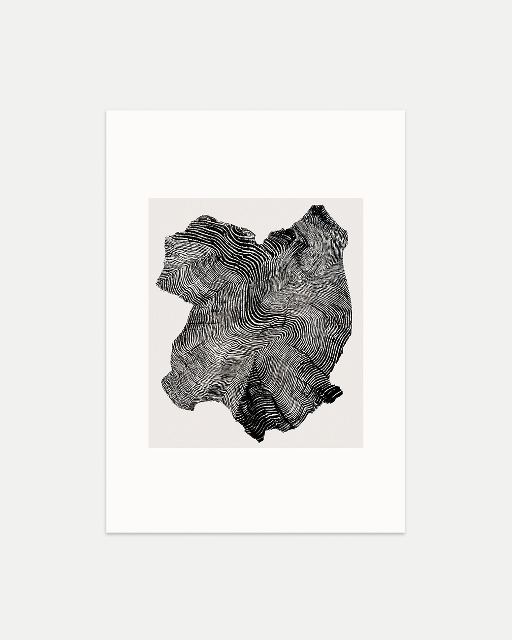 An abstract monochrome painted illustration, inspired by the cross section of a tree.